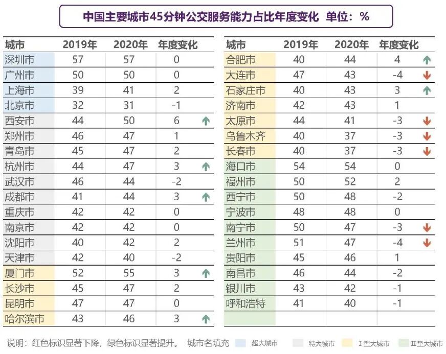 公交保障:45%的通勤者45分钟公交可达,轨道里程少的城市公交保障能力下降