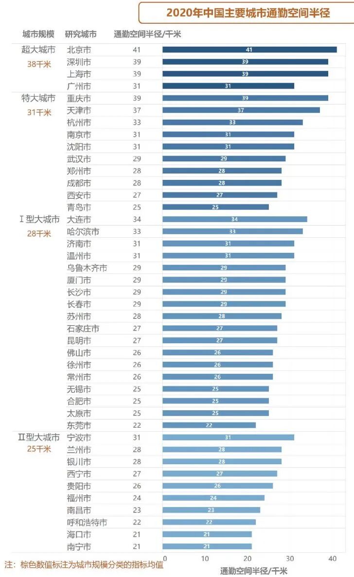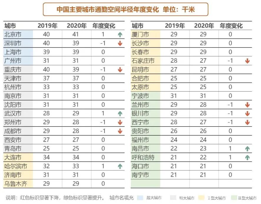 北京仍是通勤空间尺度最大的城市,半径41公里,同比增加1公里。除北京外,武汉、哈尔滨、呼和浩特、南昌4个城市同比增加1公里。深圳、重庆、郑州等8个城市小幅缩减1公里。