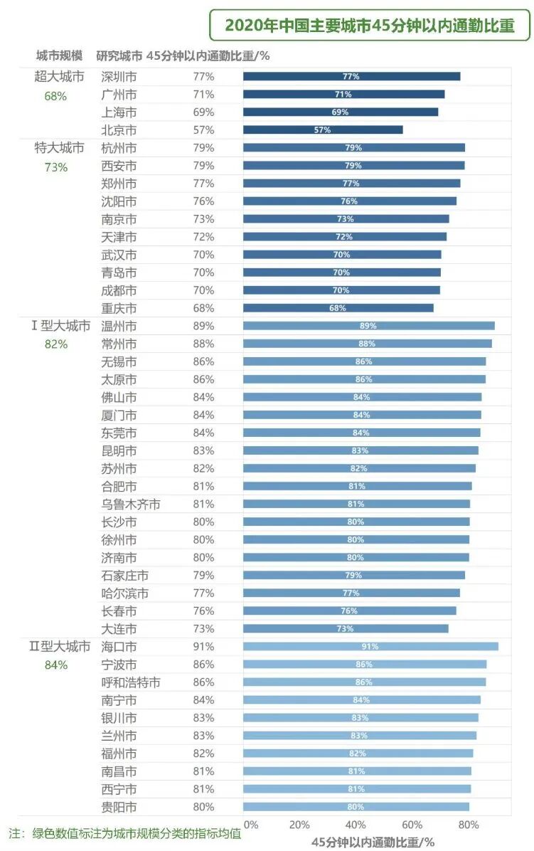 提高45分钟以内通勤比重是改善城市人居环境的重要目标,是城市规划和交通服务水平的综合体现。多项国家层面规划都将45分钟通勤比重达到80%以上作为重要目标。2020年,中国主要城市45分钟以内通勤比重总体平均水平76%,其中超大城市68%、特大城市73%,距离目标尚有较大提升空间。