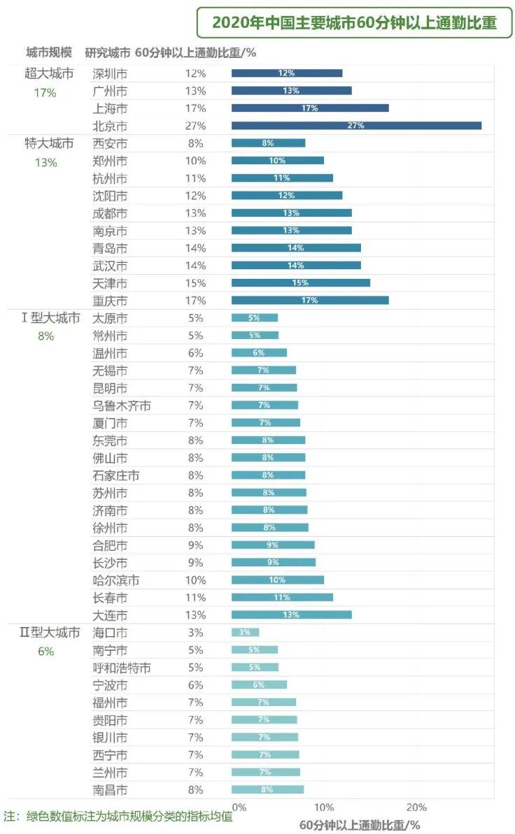 北京依旧是极端通勤人口比重最高的城市,达到27%,同比增加1%。此外,重庆、沈阳、长春、大连4个城市的极端通勤人口,也增加1%以上。