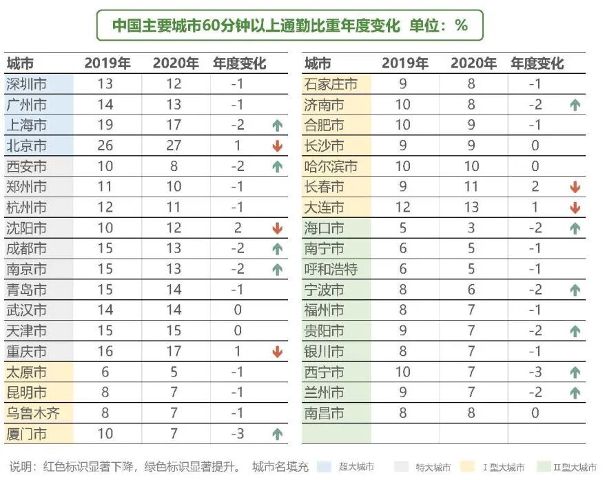主要城市幸福通勤比重同比提高1%,14个城市有提升