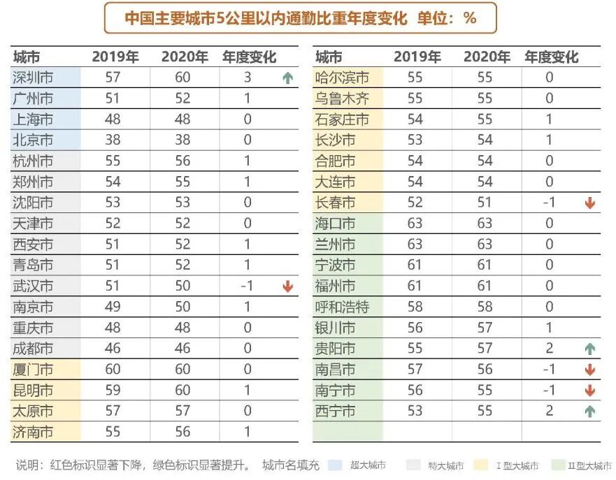 深圳5公里以内通勤比重达到60%,同比提高3%,是幸福通勤比重提升最多的城市,也是超大城市中水平最高的城市。贵阳、西宁幸福通勤比重同比增加2%。武汉、长春、南宁、南昌4个城市同比小幅下降1%。
