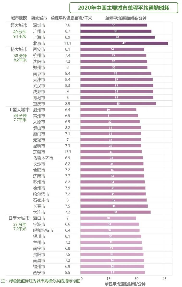 平均通勤时耗,是居民通勤出行直观感受和生活品质的重要影响因素,已被纳入“城市体检指标体系”,作为衡量城市交通便捷的重要指标。2020年全国主要城市总体单程平均通勤时耗36分钟,与2019年持平。北京仍是单程通勤时耗最长的城市,达到47分钟,同比没有增加。