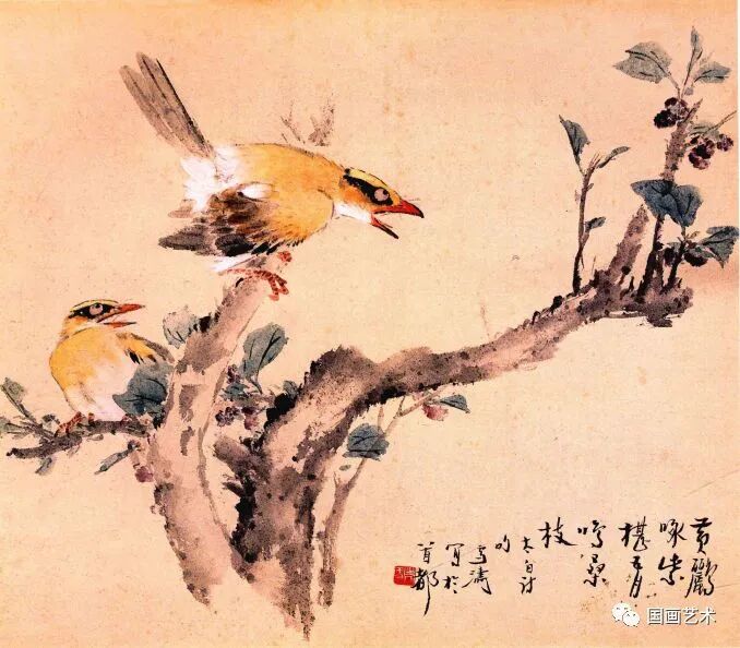 两个黄鹂,分有主次:一藏一露,一动一静。主鸟翘尾伸颈,伏身张口,栖在枝头,欲啄桑椹,与干形成破。另鸟隐身于枝叶深处,回顾鸣叫,呼应主鸟,与小横枝成破线。两干下虚而上,做了开合。虚实并用,表现明暗转折。