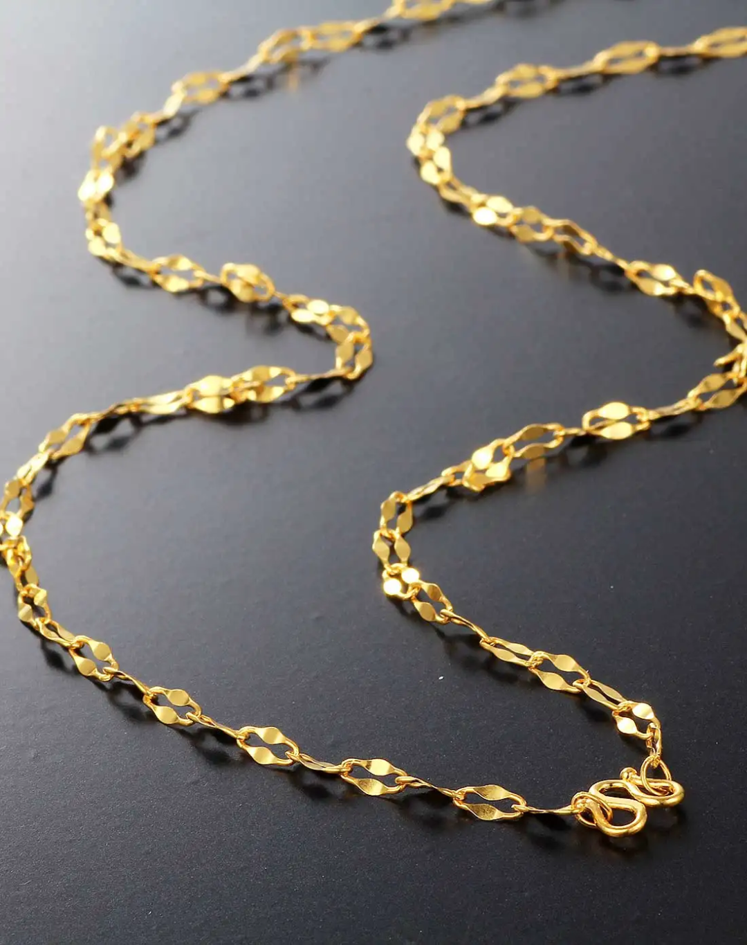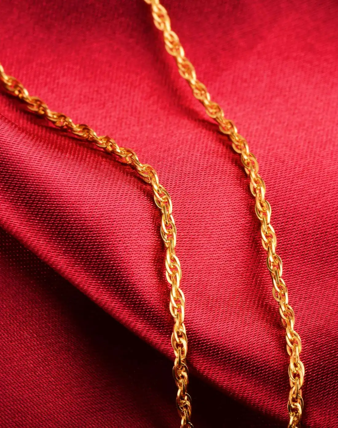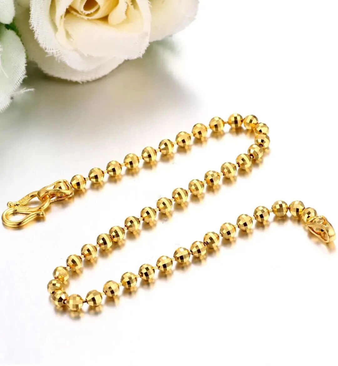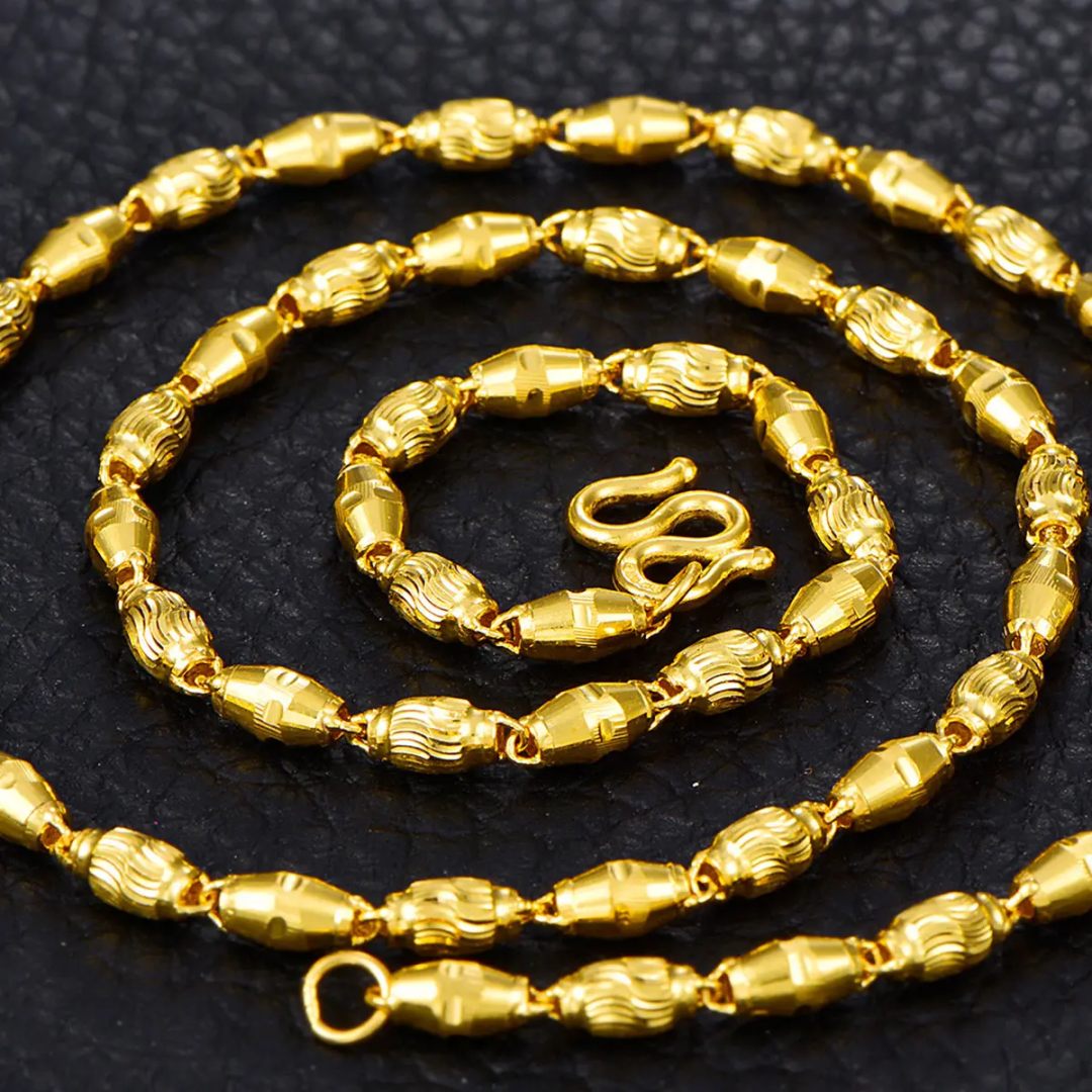 这种款式在足金项链中比较常见,由一个个橄榄形的珠珠串连而成。