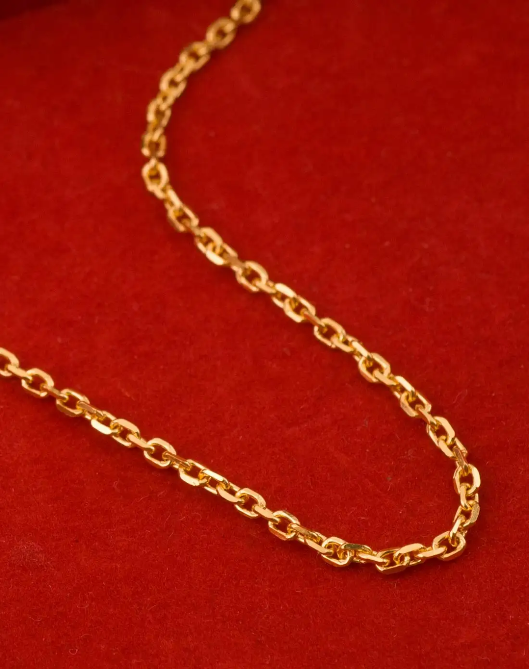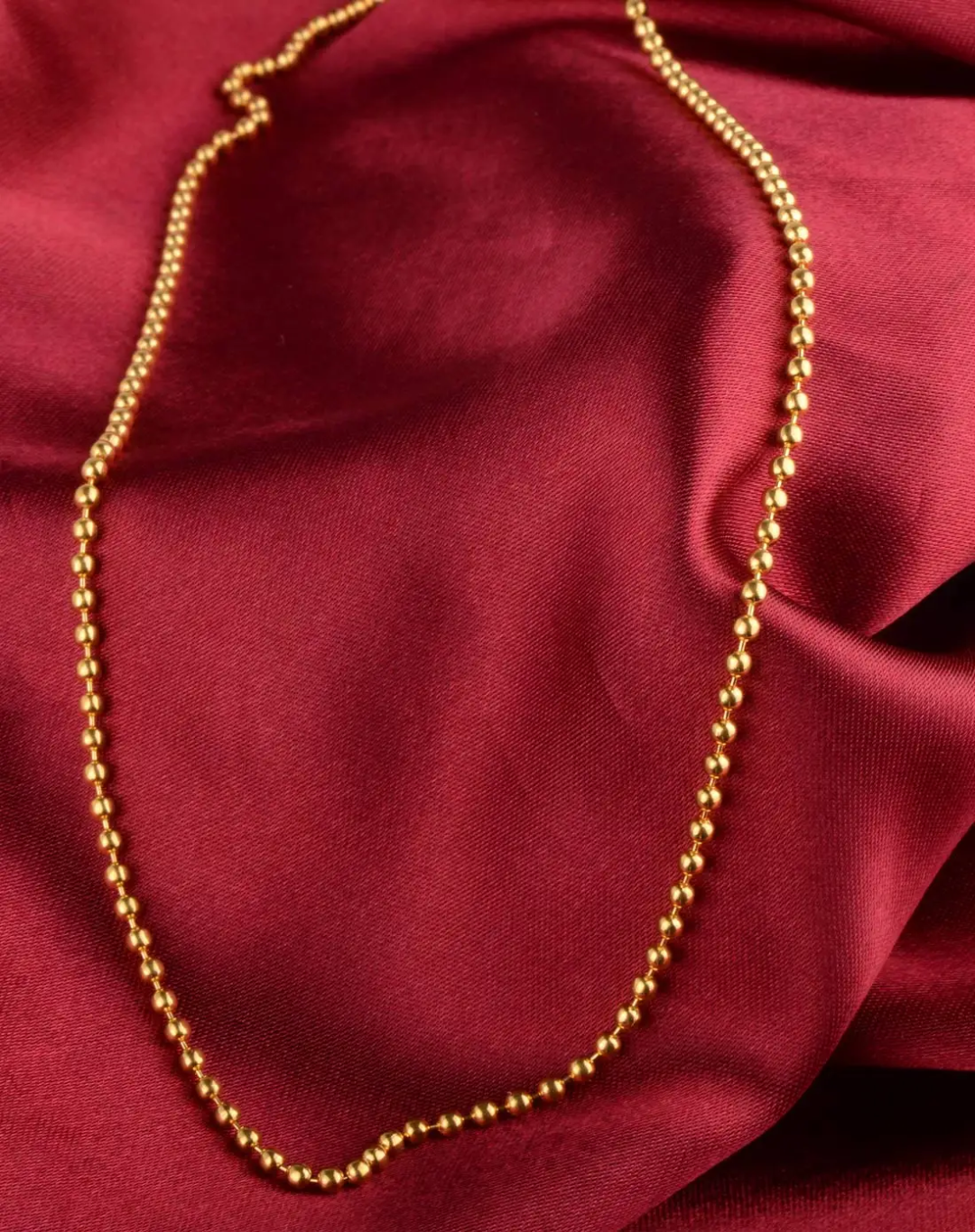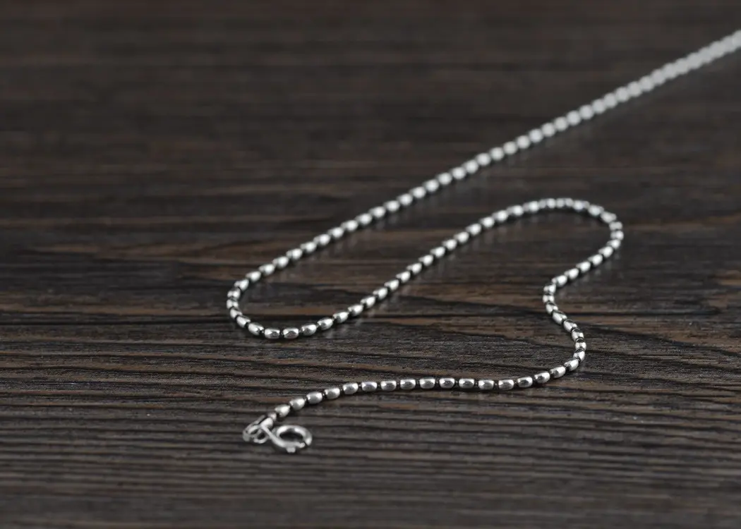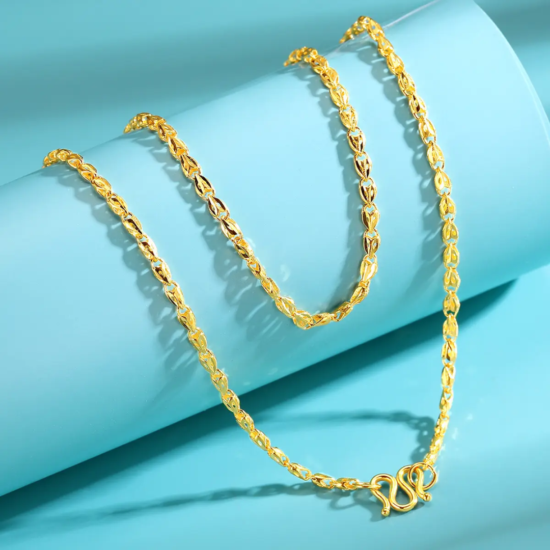 这种款式在足金项链中比较常见,由一个个橄榄形的珠珠串连而成。