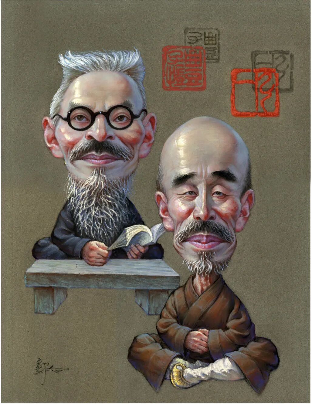 肖像漫画初学者,解决的是像不像的问题,即使如此,也有部分漫画人没有解决此问题;像了之后就是漫的问题,需要漫画的各种表现手法的综合运用,漫的问题解决了,才算跨入漫画的门槛;画出来了,并且夸张性地深刻地表达出了被画者内在的精神气质及思想,那就达到神的境界了,能达到这一步的漫画人也不多;至于逸,那是可遇不可求的境地,不仅需要个人艺术素养的综合,还需要个人的丰富经历与机遇。逸品的产生,是时间沉淀与过滤的结果,其意义远超作品本身。