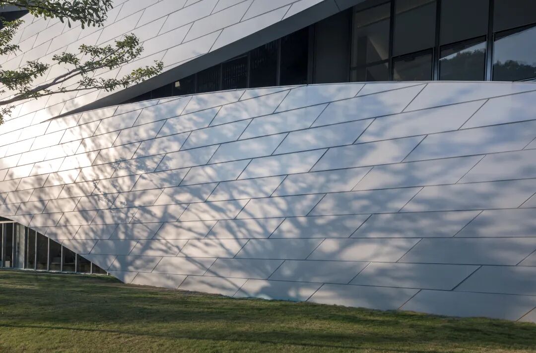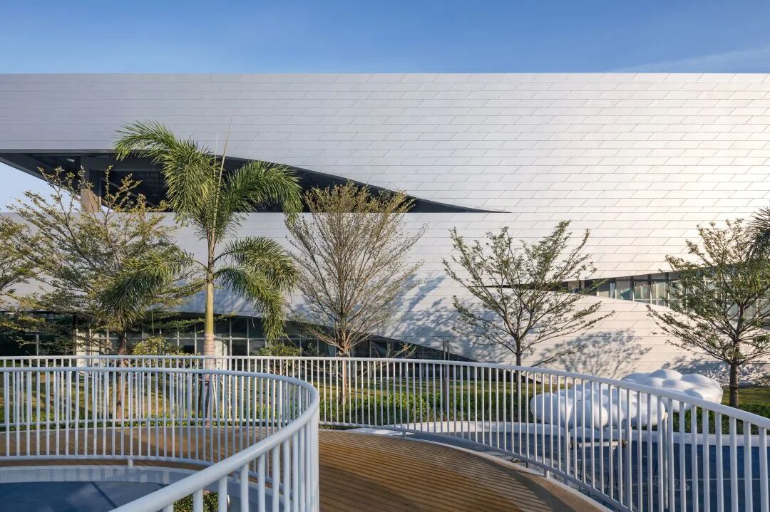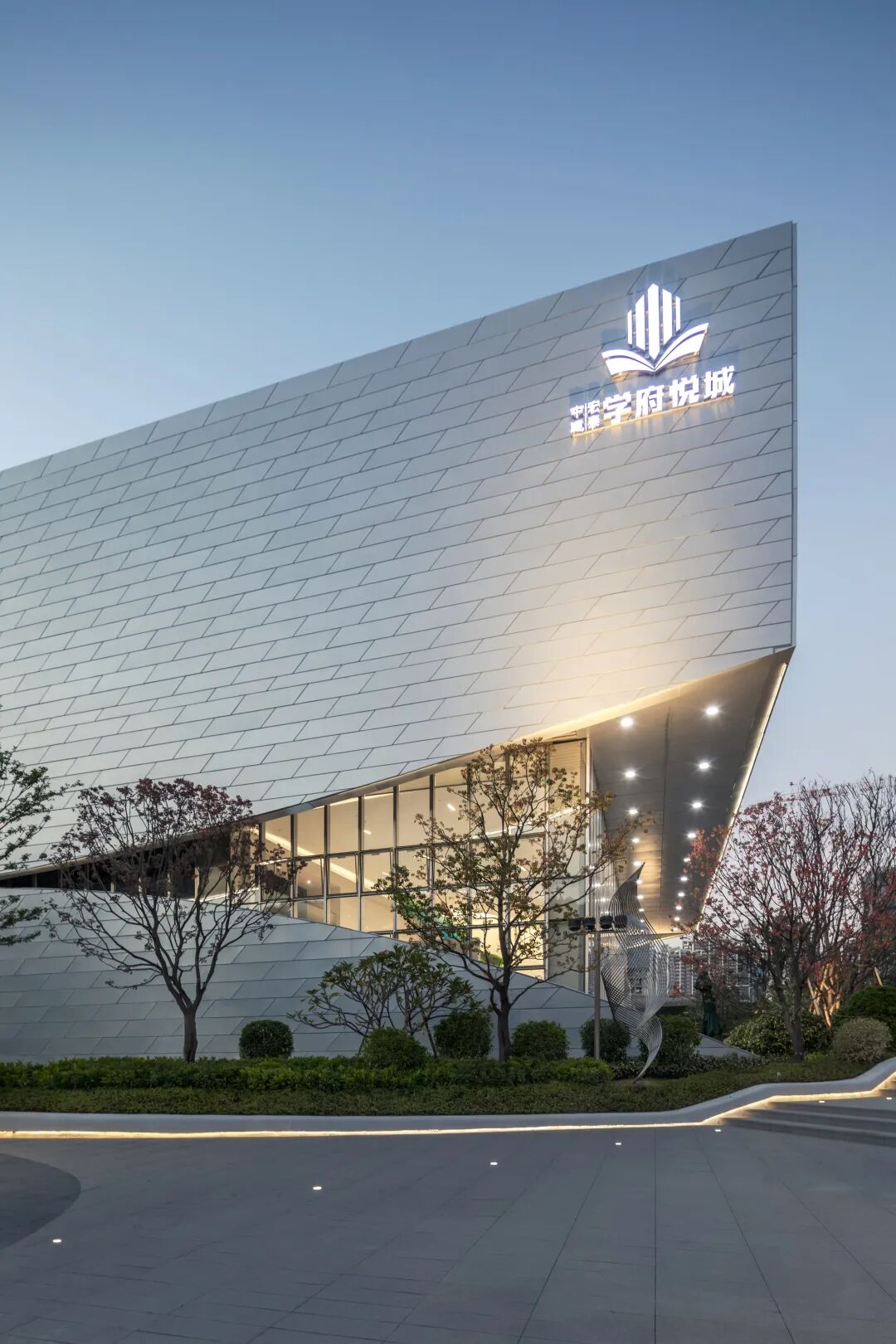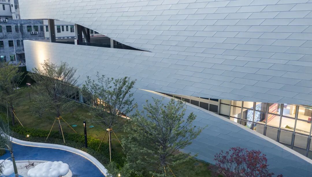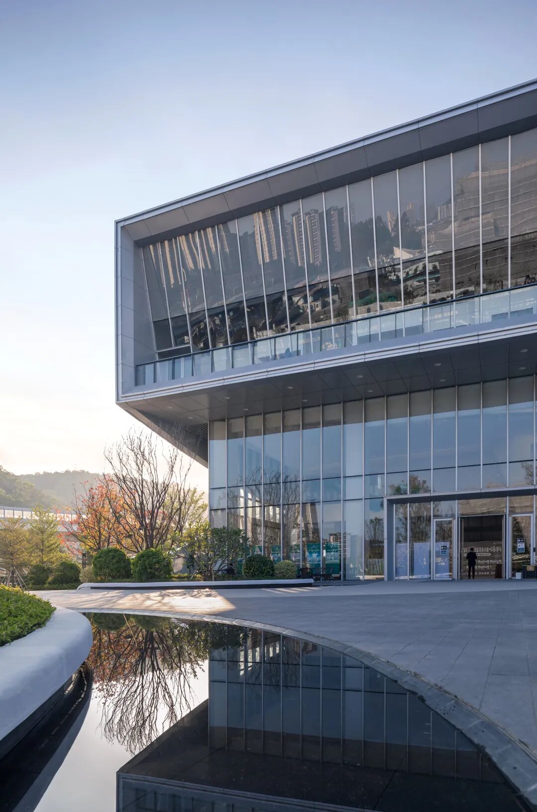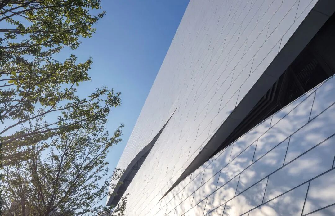 而另一侧的铝板幕墙,在不同晨昏光线调和下,金属的冰冷质感被削弱,呈现出流动的光影效果,让建筑成为一处值得驻足欣赏的日常风景