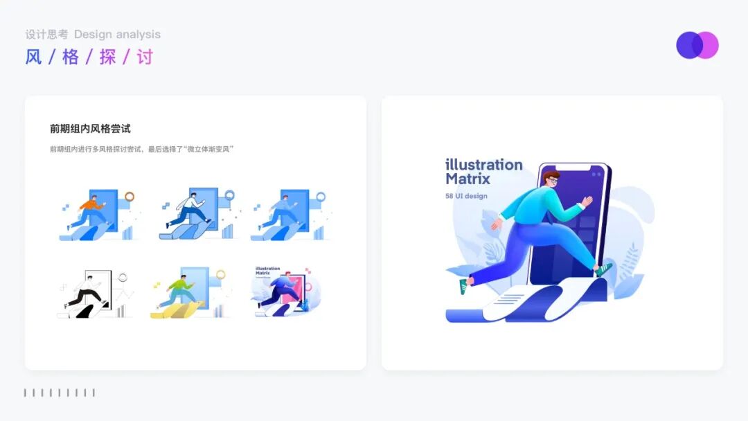 风格选取不仅需要考虑到品牌的差异性,也要遵循可落地性、精致性、延展性等特点。我们摒弃了常规的扁平风格和需要大量人工投入的3d插画。几何插画又过于抽象,不能达到很好的直观理解,所以这些风格都被一一排除,最后选择微立体的渐变风格。