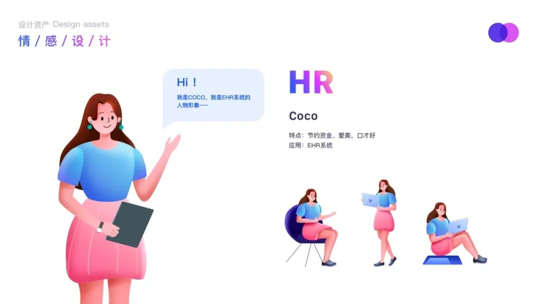 根据不同业务线,给每个产品线定义对应的人物角色,并让人物更具有鲜活特性和故事性。如:hr叫coco,58员工-男程序员叫马克,攻破代码意思,客服叫vivi,对应客服打电话“喂喂”的声音。
