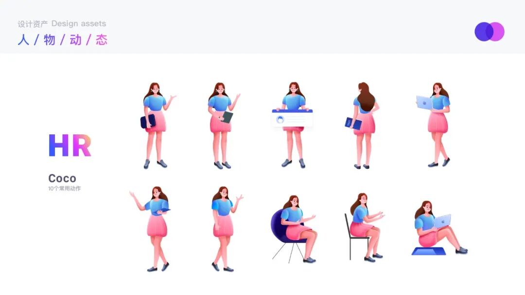 结合企业场景选定常用的人物动态:走路、坐、站立、指向等。以coco为基础人物,设计10个动作,并针对8个角色,复用10个人物动态,共完成70+人物动态设计。