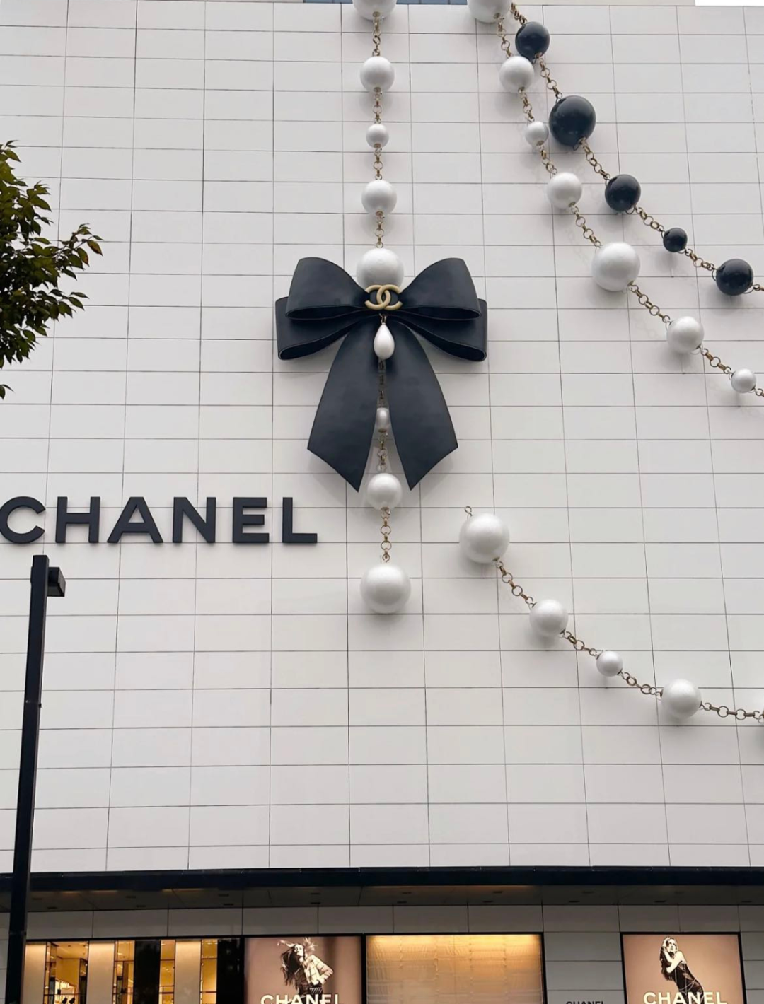 一只巨大的黑色蝴蝶结和几串珍珠链子设计