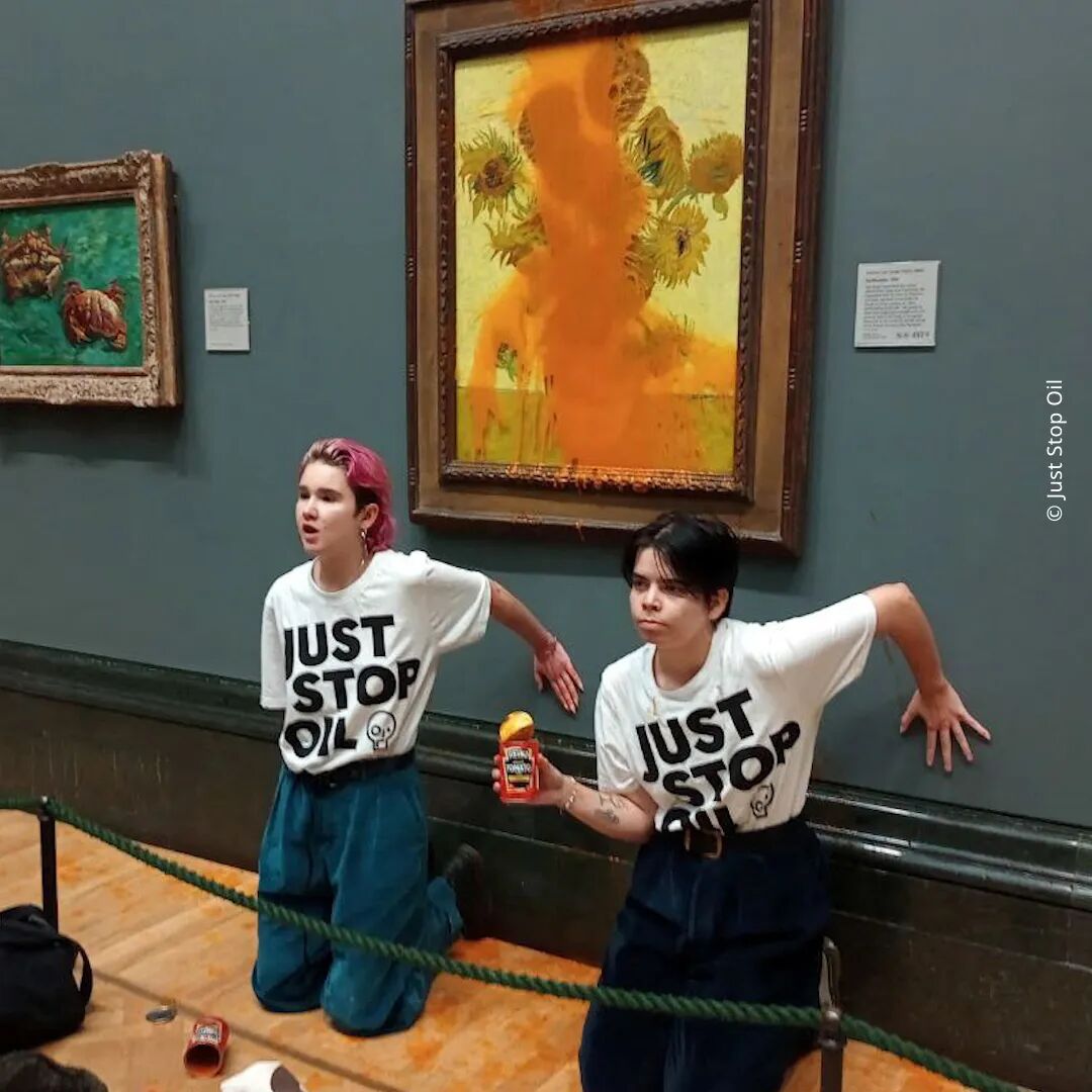 前两天,在英国国家美术馆,两个00后环保主义者趁身边没有人,把番茄酱猛地泼向了梵高的《向日葵》。