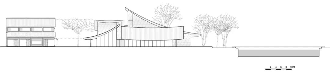 屋顶从中心向四周延伸,解构的屋顶对应不同的功能区:门厅、前序厅、展览厅和服务区,形成了一个不对称的风车状集群,在传统建筑的对称结构中增加了现代语言的不对称节奏和动态。