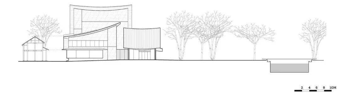 作为“宅沟”理念的延续,该项目保留了周围水系,并在建筑的南部和东部修建了新的桥梁,将场地与水上空间连接起来。设计遵循木构老建筑的尺度,设计了由绿植和水景组成的汀州景观,延续了传统的空间布局,创造了自身与当地文化之间的对话。
