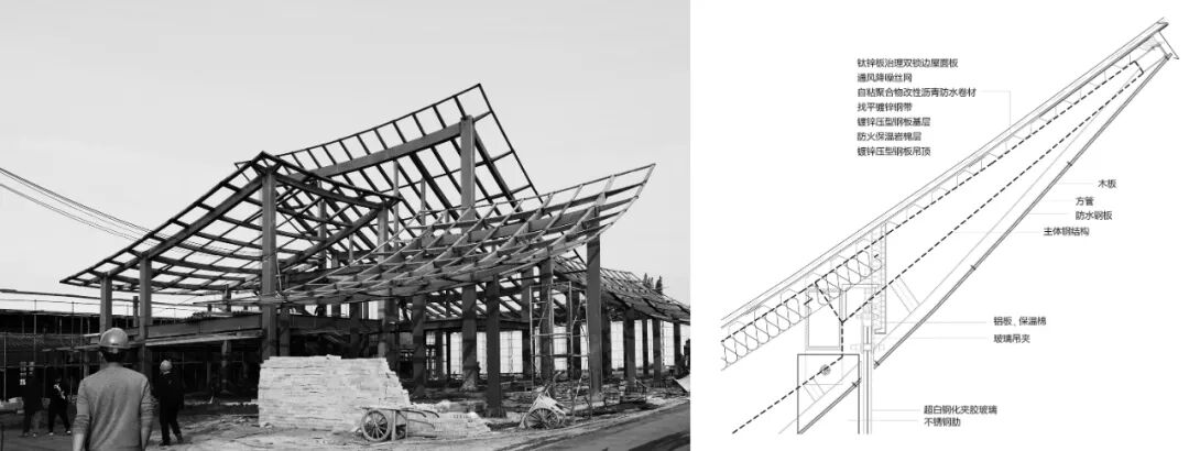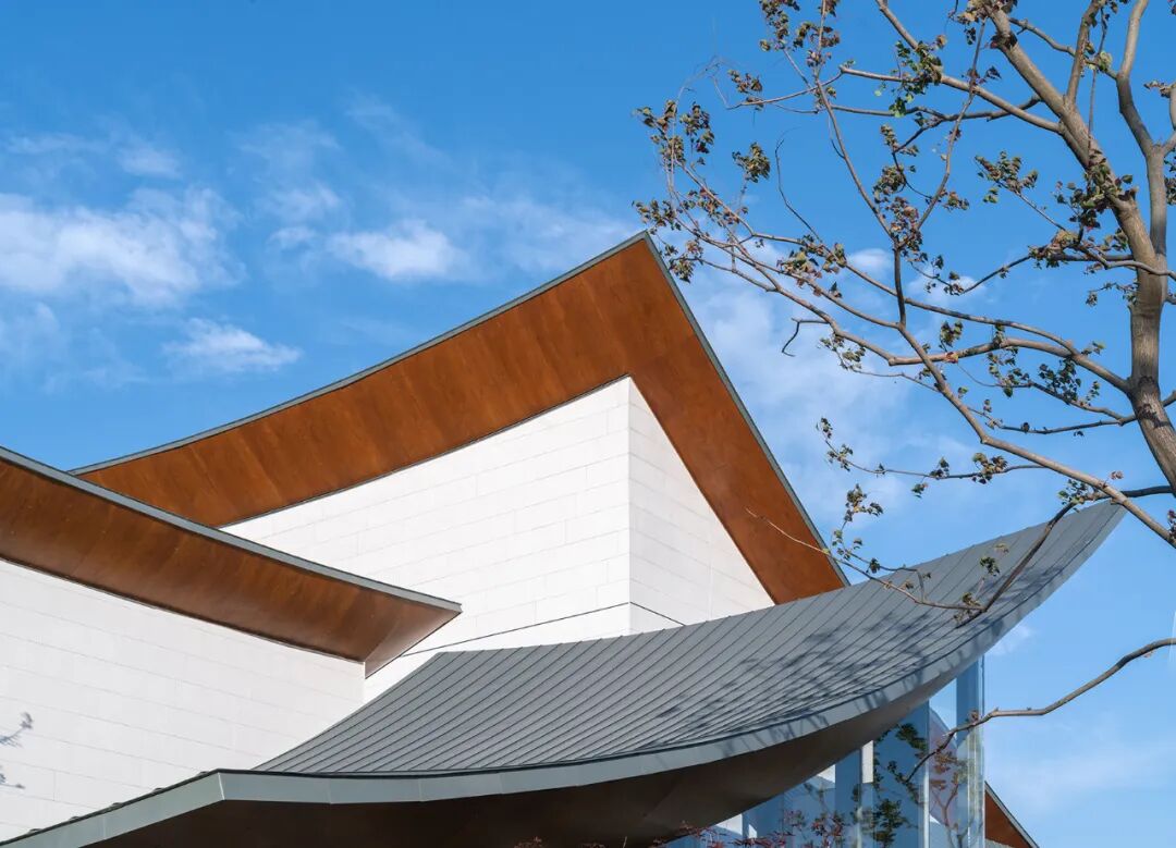 屋面材料为环保型钛锌板,这种轻质屋面材料具有天然耐腐蚀性,适合海门潮湿的亚热带季风气候。石墨灰色金属与弯曲面钛锌板重叠,与老街建筑中传统的灰瓦白墙相呼应。