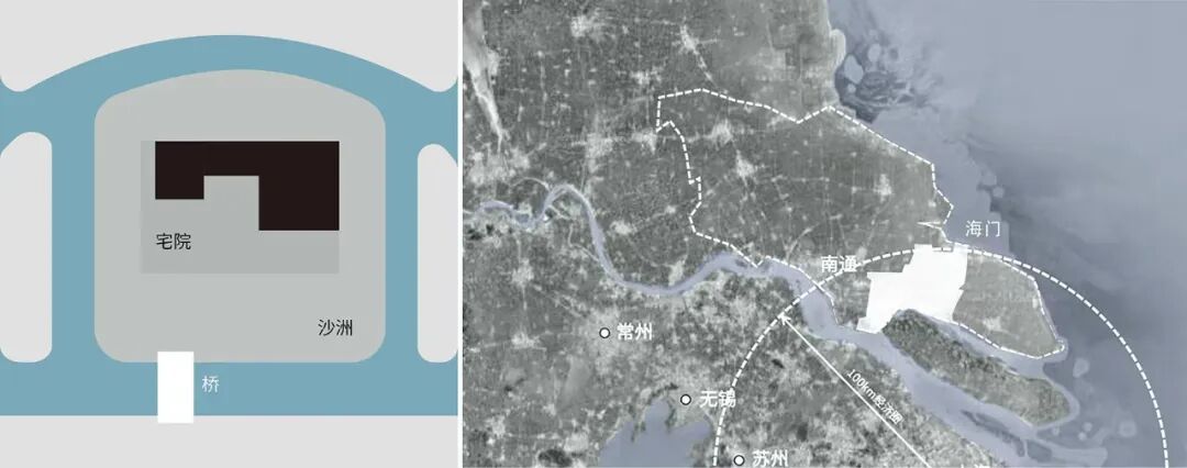 謇里小镇展览馆以长江入海口北岸崇启海地区(崇明、启东、海门)特有的“四汀宅沟”为原型,依水而建。受地势低洼、多沙的地理条件影响,当地人大多从宅地周边挖沟取土,筑高基地,形成环宅沟渠形态。