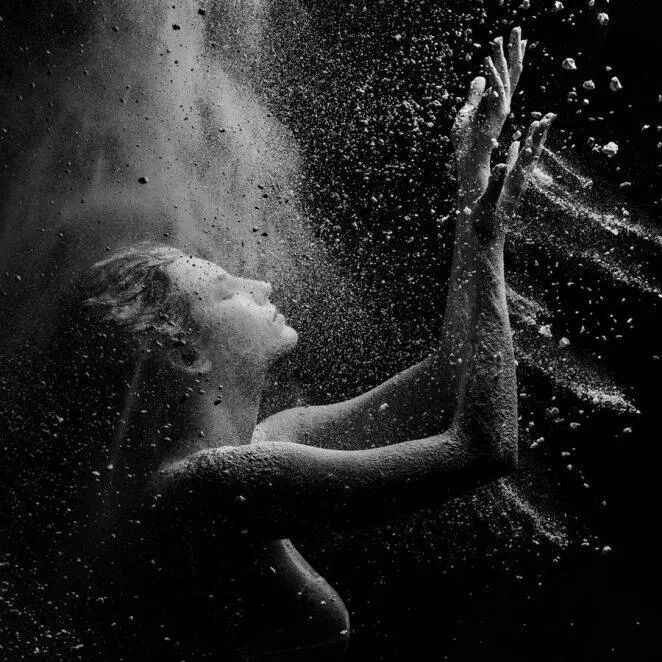 为了渲染舞者的舞姿,摄影师还为舞蹈中的舞者,添加了一些小道具,这个小道具就是面粉,当面粉碰撞到舞者身上,爆炸起来的粉末,让舞者舞姿更具有力量感与视觉冲击力。仔细观察这些面粉会发现,摄影师并不是随手往舞者身上一撒,而是根据舞者的动态去运动,两者相辅相成。