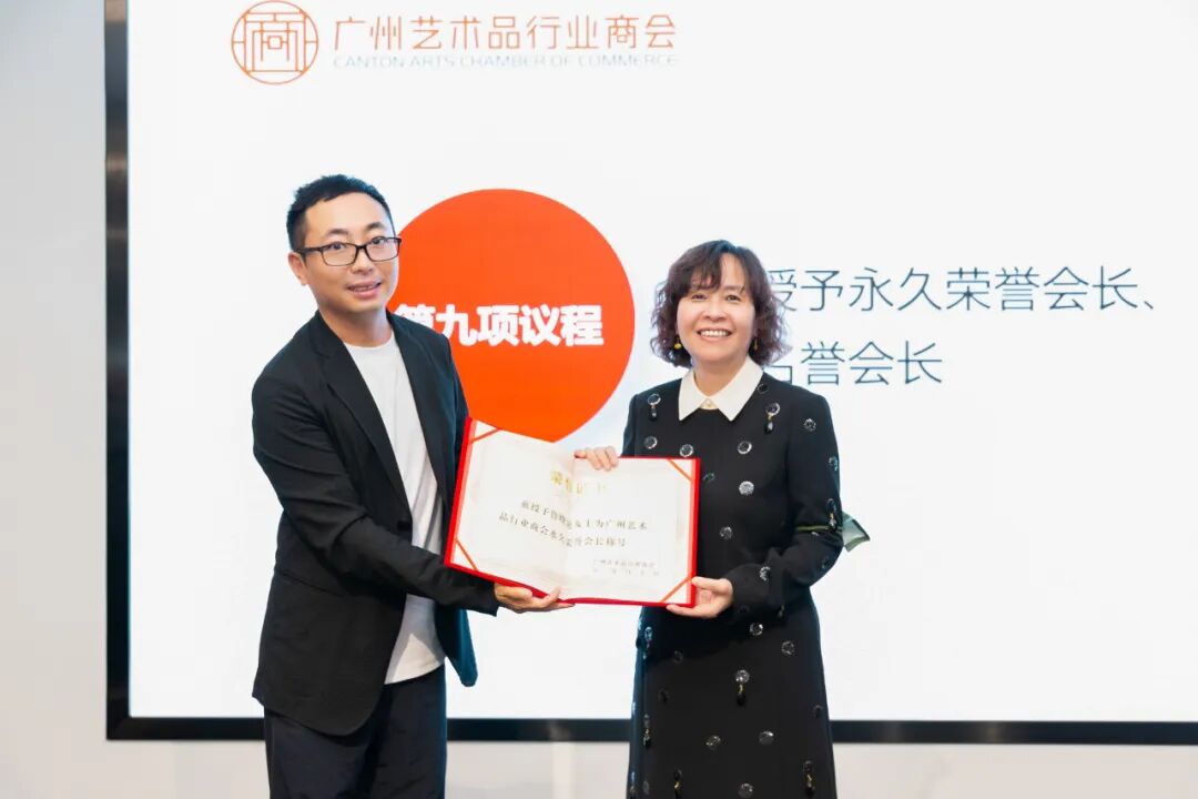 3月31日广州艺术品行业商会第四届会员大会第一次会议暨换届大会在工美港广东工美艺博中心召开,向仕杰当选为商会新任会长,授予鲁晓昆永久荣誉会长、授予黄德功名誉会长。