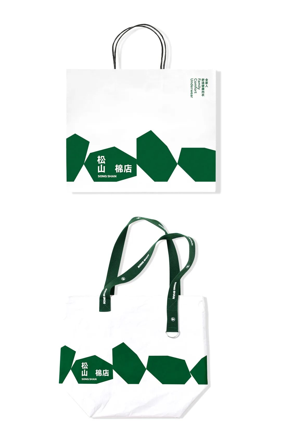 在字标的组合形式上。有别于水平或垂直排列的中英文字体,「松山棉店」与「SONG SHAN」则采用了左右结构的非对称形式,「松山」二字为竖排,「棉店」横排,有较强的视觉冲击力,给消费者形成深刻记忆。