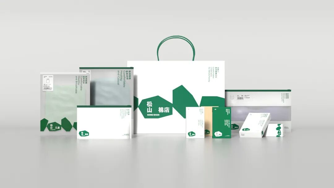 全新的七边形品牌图形也被赋予了丰富的延展性,在保持视觉统一的基础上,通过旋转、变化延展出了品牌6大品类的专属icon。既像松树,像石头、像棉花的七边形LOGO,代表了松山棉店产品的六大品类。