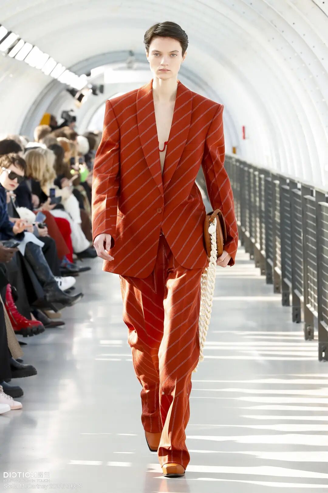 上衣配有 McCartney 系列独特的标志性袖子:以褶皱窗帘的方式在肩部缝制的应用程序,褶皱是惯常使用的手法。肩部而慢慢散开,打褶的方式用柔美的形式演绎,走动间增添了自然的动感与造型感。