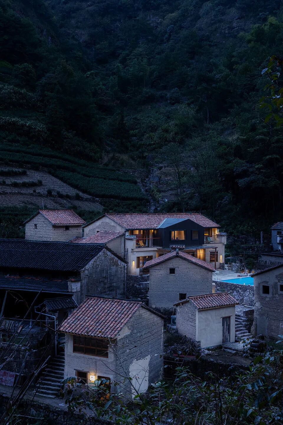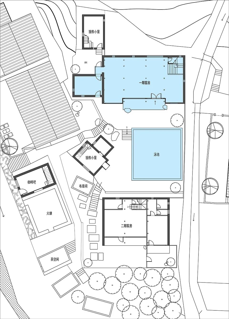 踏雪九里项目占地约2000平米,包含6幢大小不一的夯土屋。结合展哥多年对理想生活的探寻,设计并没有奔着“房间数最大化”的目标而去,在明确需要8间客房后,更多的空间留给了精神诉求,譬如社交型公区、书吧、咖啡馆、茶空间,户外泳池、营地、茶园、果园等等,让前来入住的客人不仅仅是满足睡眠需求,更是一种乡土生活方式的体验。