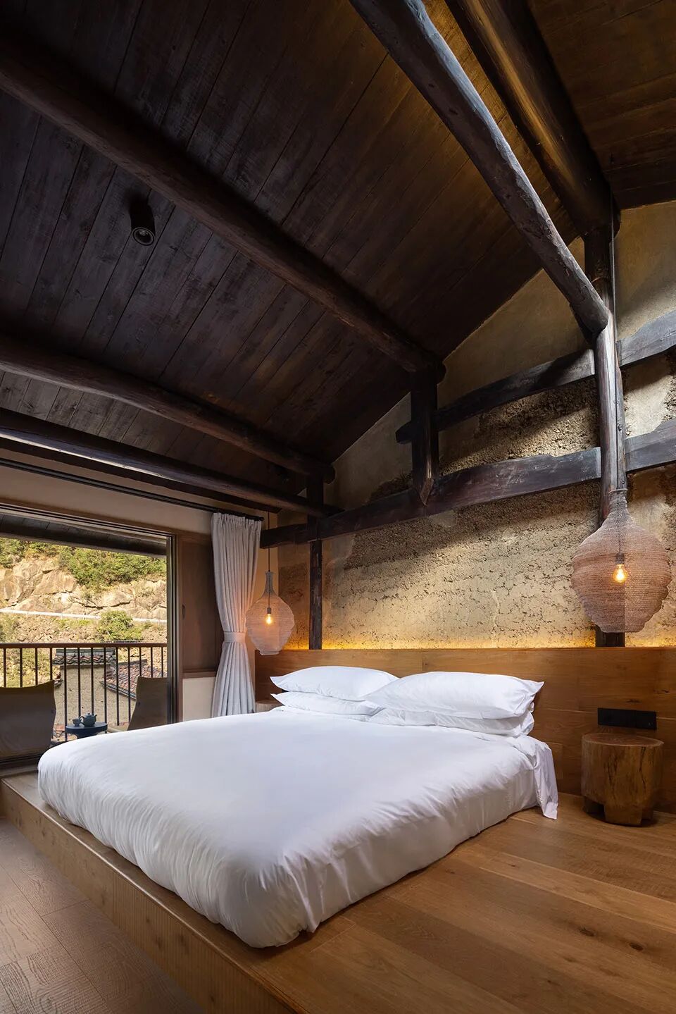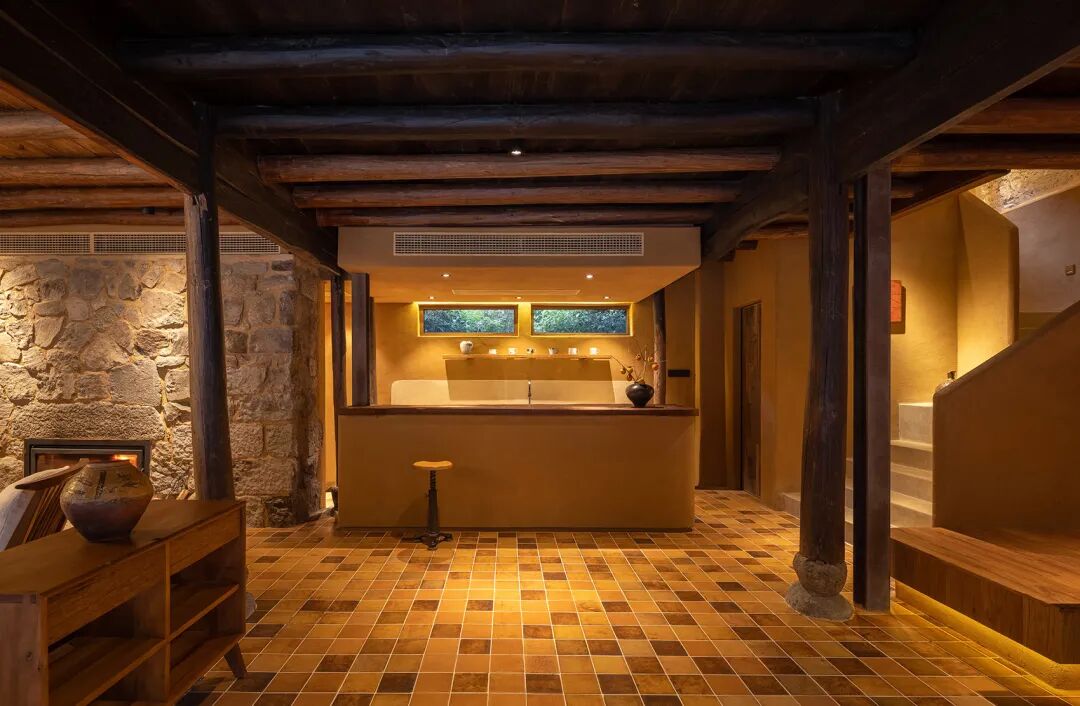 本着不破坏村落原始面貌的原则,建筑改造上保留原来的夯土墙和木行架。为了让每一层都拥有更舒服的层高,一楼地面下挖20公分;二楼则在保留原建筑顶部高度不变前提下,将屋面延展角度打开、将屋檐上抬60公分,从而提升了二楼的整体层高,由此增加的檐下空间补充成为每间客房的阳台。此番操作,既改善了原有民宅空间低矮的不足,又扩充了客房的使用空间,同时在升高的墙面上增加采光窗,令整体变得更加亮堂舒适。