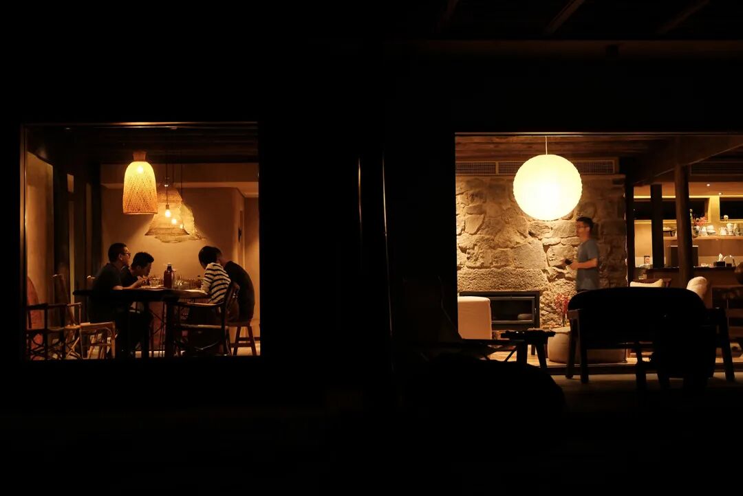 目前开放营业的一期,体量不大但功能齐全,有3间客房+1个公共活动区域,包括客厅、餐厅和书吧,门外还有一个6米x10米的泳池,里面的水来自天然的山涧溪流。大厅中心是休息区,原石砌成的壁炉墙拙而美,吊挂着漂洋过海而来的野口勇球灯,搭配着中岛乔治的沙发,懂的人自然懂了,爱的人已然爱了。傍晚,燃起篝火,窝进沙发,世界与心境都无比安宁。