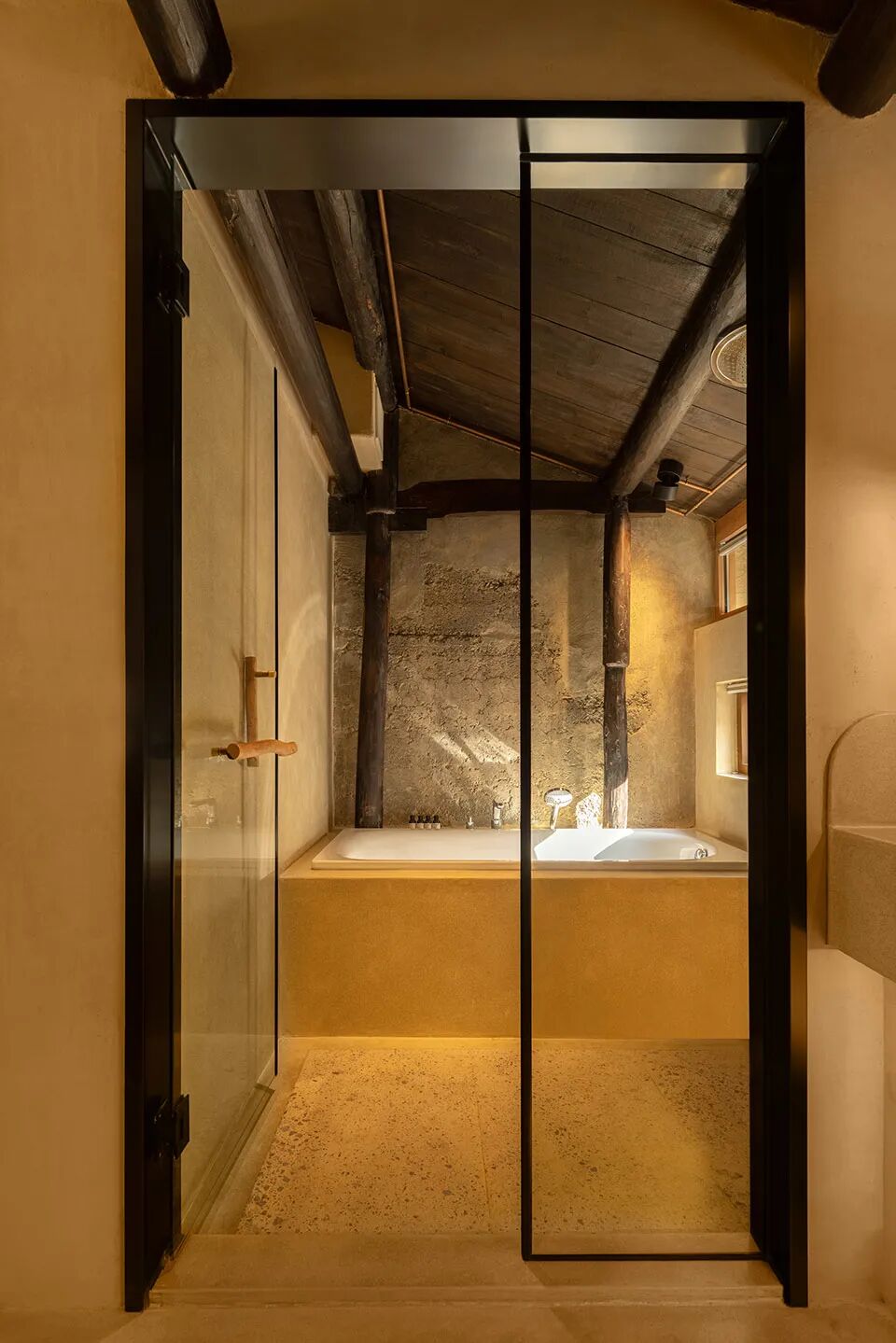 沿转角楼梯路过一扇老旧格子窗上到二楼,这里是三间客房。每间都尽可能保留了老宅原始的夯土墙面和古法制作的木构梁柱,并在顶部悄悄加开一道天窗增加采光。岁月流淌的痕迹,在拙朴的空间里慢慢散发。