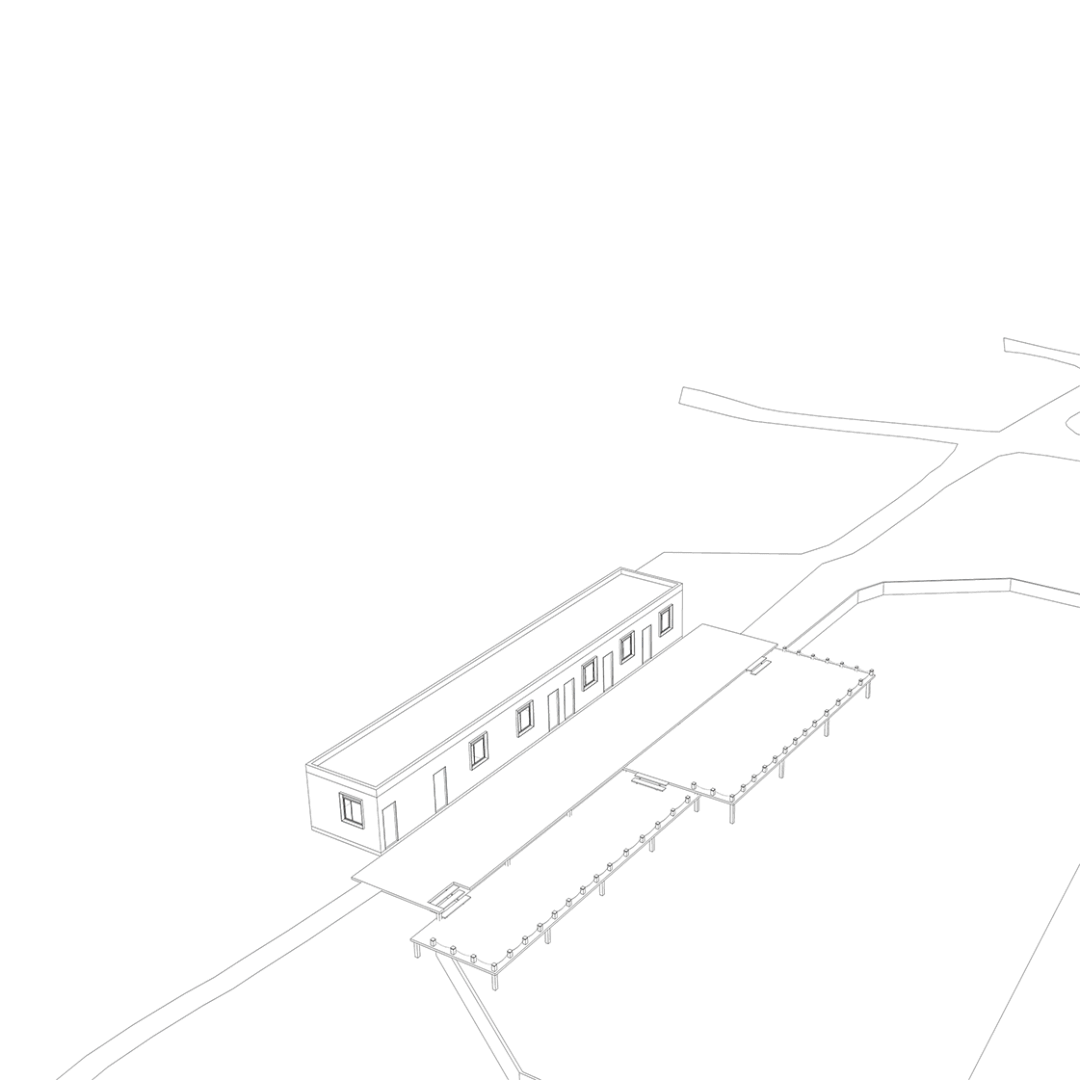 建构的前提一定是阅读场地与判断建筑走向。场地贴临国道福兰线一侧,而原主体建筑基本平行道路走势,因此设计在二者之间进行了景观手法干预。在保留周围所有乔木的前提下增加水塘面积,并设置木构平台,提供休憩玩耍的活动可能,建立一个相对热闹的场所,以接纳路面传来的噪音。