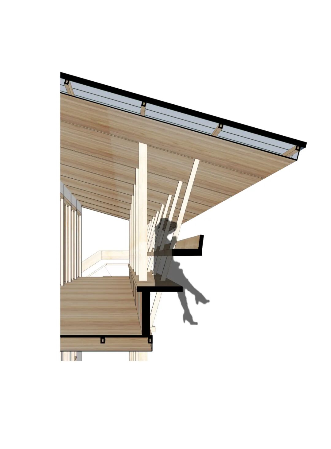 设计将这种轻盈的建构转化为驿站的改造逻辑,选择扁平屋面,隐藏大部分的屋面底部结构,营造薄却深远的挑檐,使得整个建筑加建犹如一个大型凉棚,通过几根极细的立杆,支棱在村口的田野间。