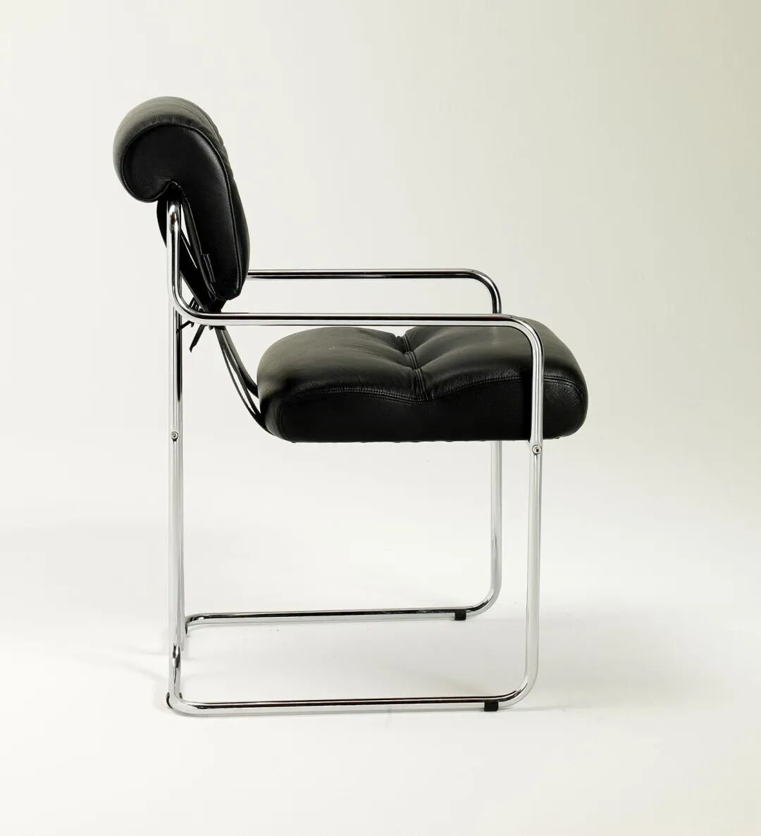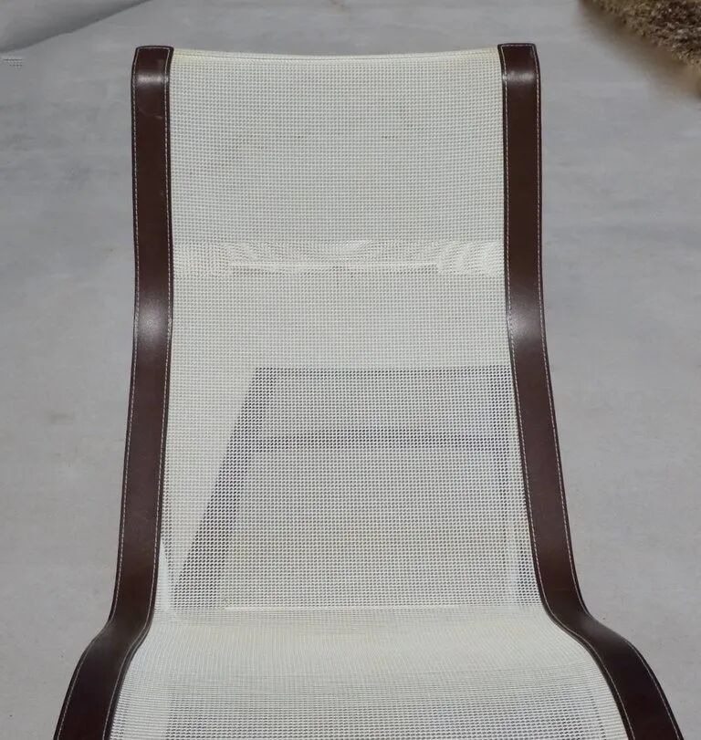 它的框架采用镀铬管状钢,使形状具有线条连续性和座椅舒适的效果。靠背通过两条马鞍皮革大带固定在一起。