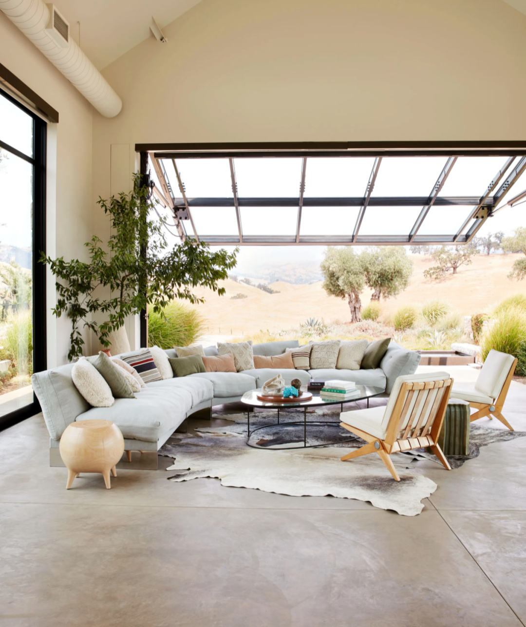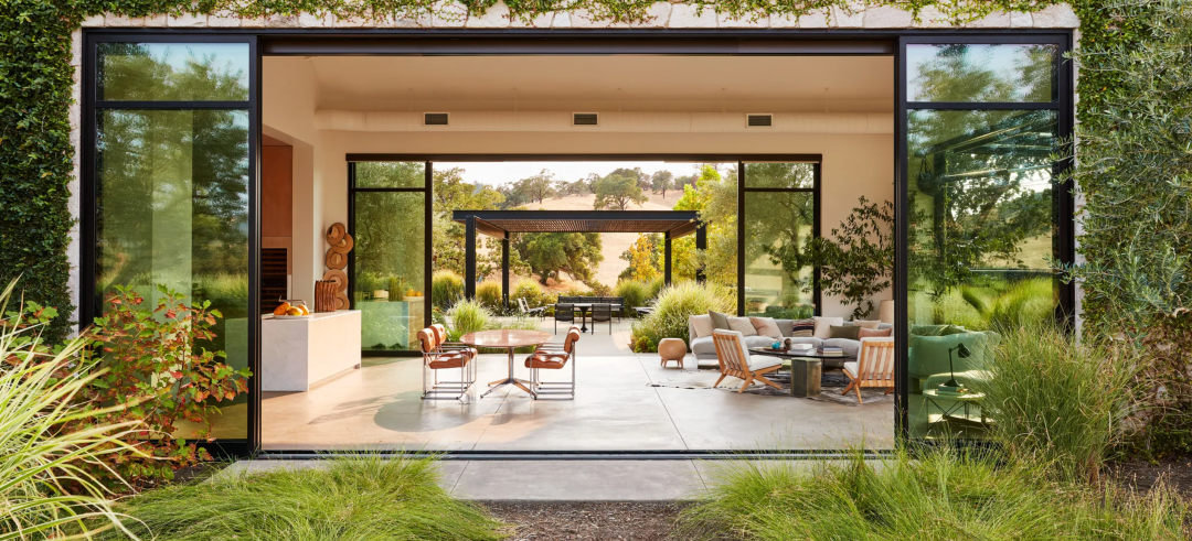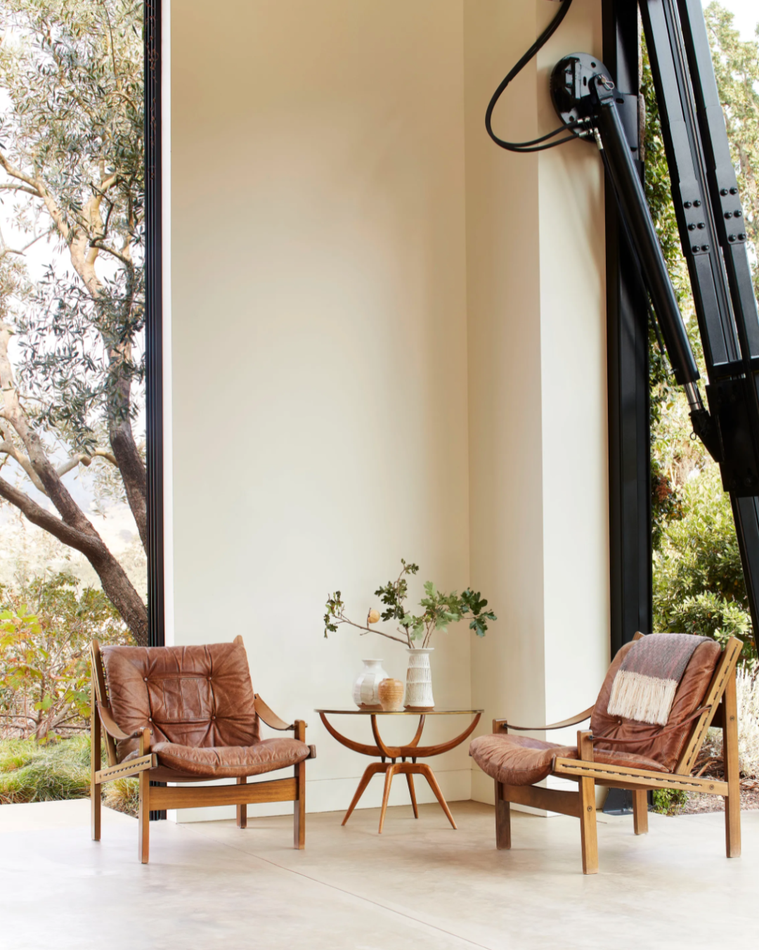 液压升降的窗户打开了客厅。赭色沙发和鸡尾酒桌;Pierre Jeanneret 休闲椅;Caleb Woodard(左)和 Floris Wubben 的边桌。简单又随意地摆放无论是家具的色调还是造型都组合的恰到好处。