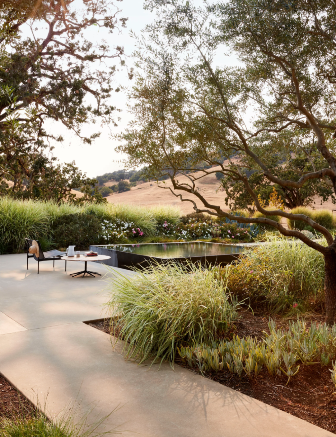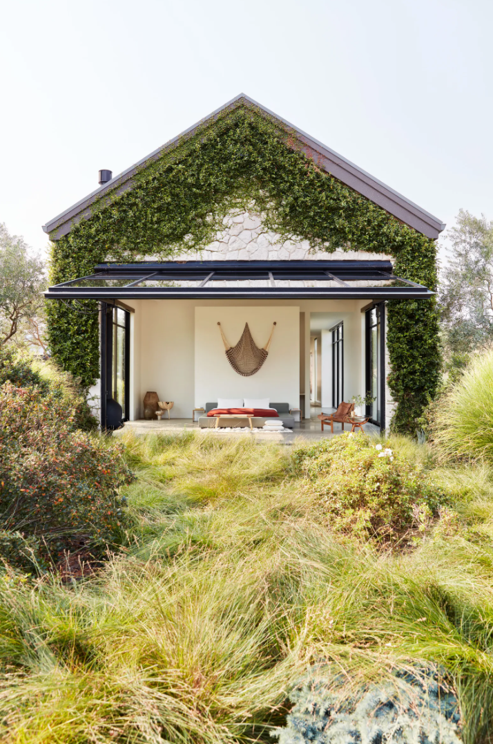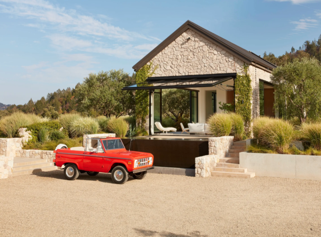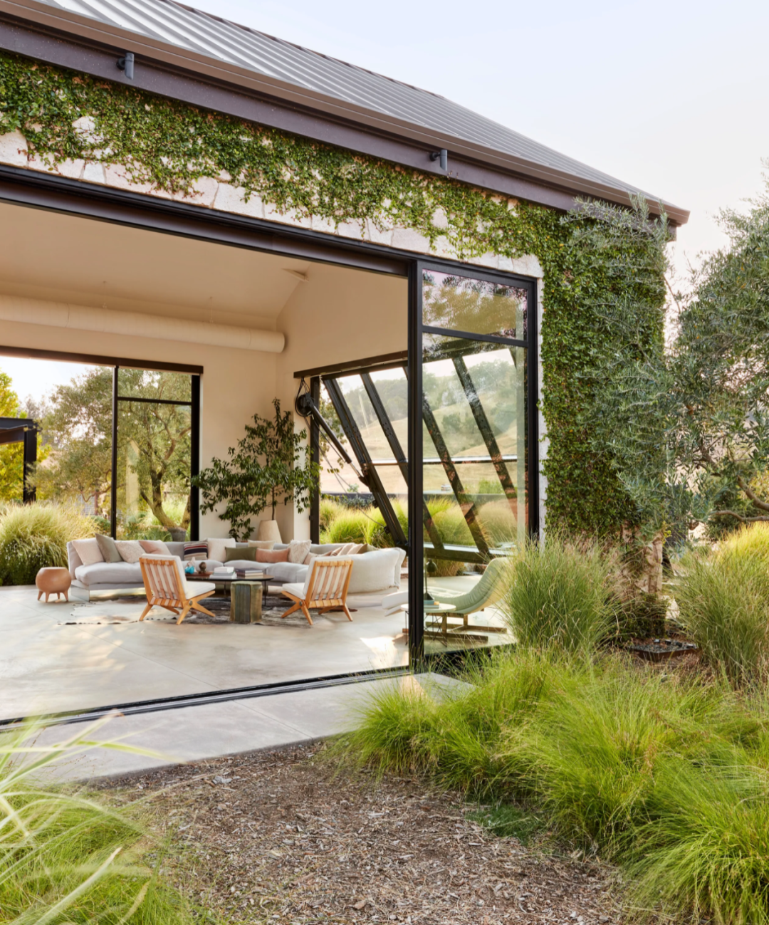 液压升降的窗户打开了客厅。赭色沙发和鸡尾酒桌;Pierre Jeanneret 休闲椅;Caleb Woodard(左)和 Floris Wubben 的边桌。简单又随意地摆放无论是家具的色调还是造型都组合的恰到好处。