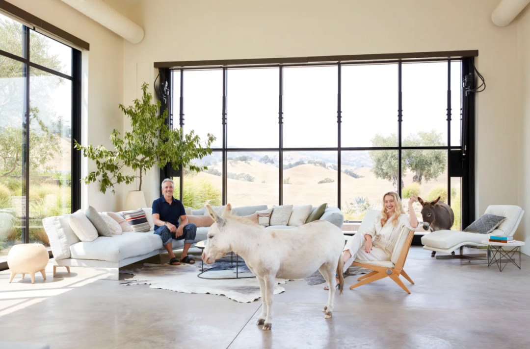 Gordon 和 O'Neal 和他们的两只宠物小驴 Sugi 和 Jinx 在起居区