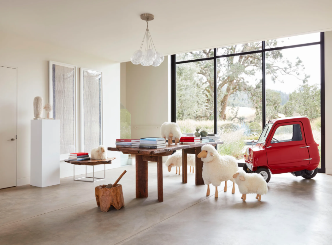 Kristina O'Neal 的艺术品采用 19 世纪解构家具的面料制成,挂在白色的墙壁上。在中央入口大厅可以还找到一些奇思妙想:一群来自当地商店的木头和羊毛羊,以及最小的生产型汽车 Peel P50。