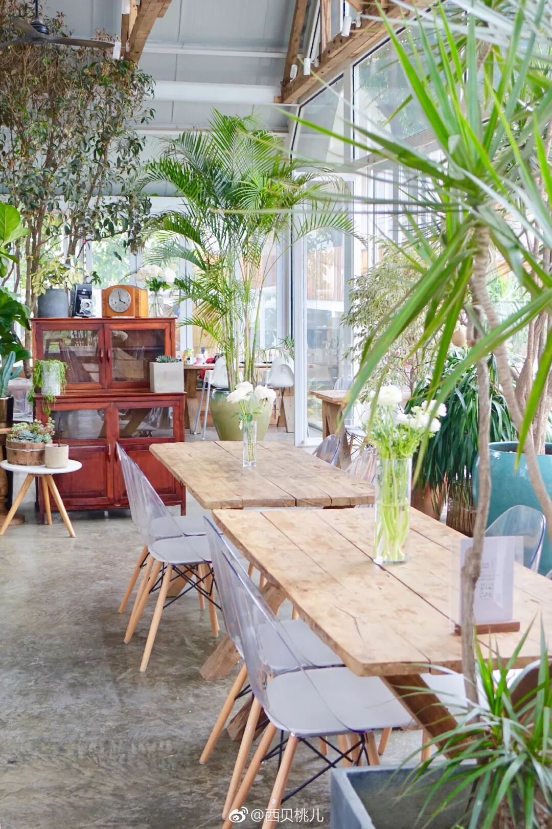 原木长桌,白色透明椅,