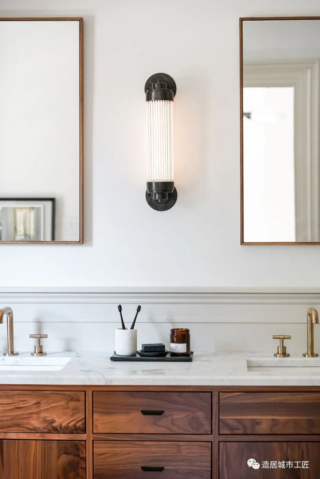 卫生间洗手台区域也属于干区,而这个区域可以进行拆分,比如镜柜下方离洗手台近的地方用瓷砖,镜柜上方用乳胶漆。