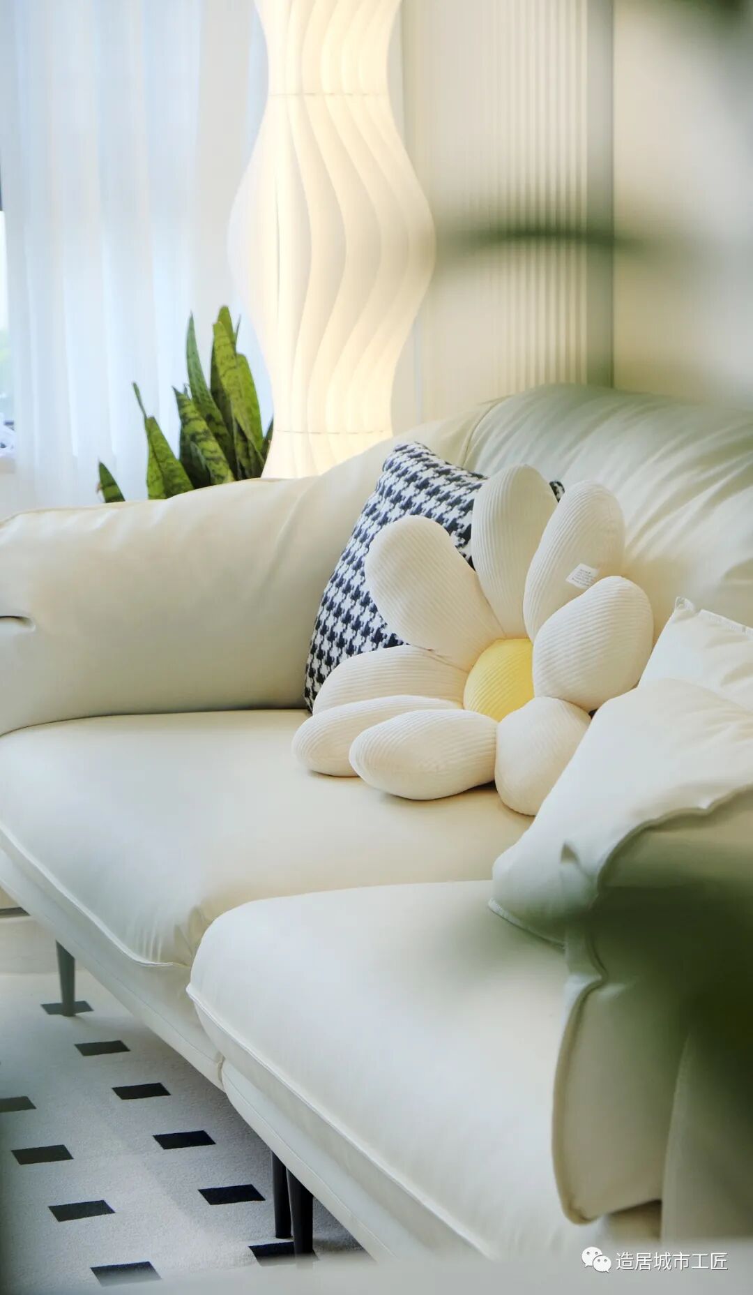 将具有一定体积的白色草裙灯,放置在圆润的沙发旁边,不仅可以融入整体,让空间在视觉上得以延伸扩容,还能平衡装饰画、花瓶、抱枕等软装过于明亮的黄色,使得整个空间在看得舒适的同时还能住的舒适。