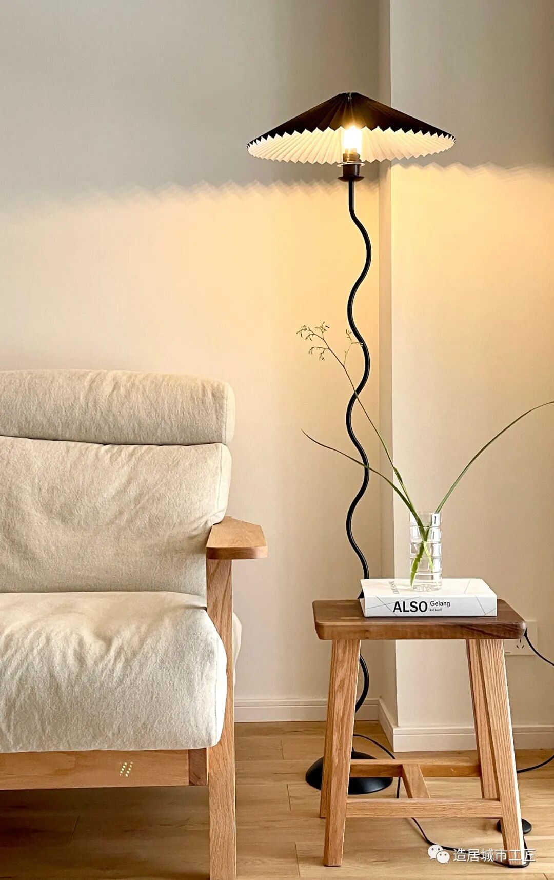 为了让大家有了更直观的了体验,造居君就在它多个款式中,选购了一款墨绿色灯罩、黑色灯体的百褶落地灯放在日式风的案例中给大家进行了展示。