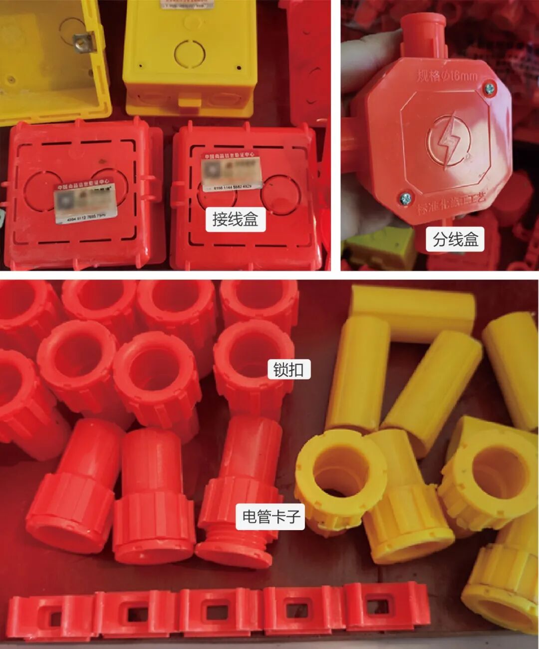 开关、插座的底盒叫接线盒,每个接线盒后面都有二维码,可以扫描检验真伪。电管的连接件看起来很厚实,每一件产品上都有凹凸的型号或者品牌印刷字迹。