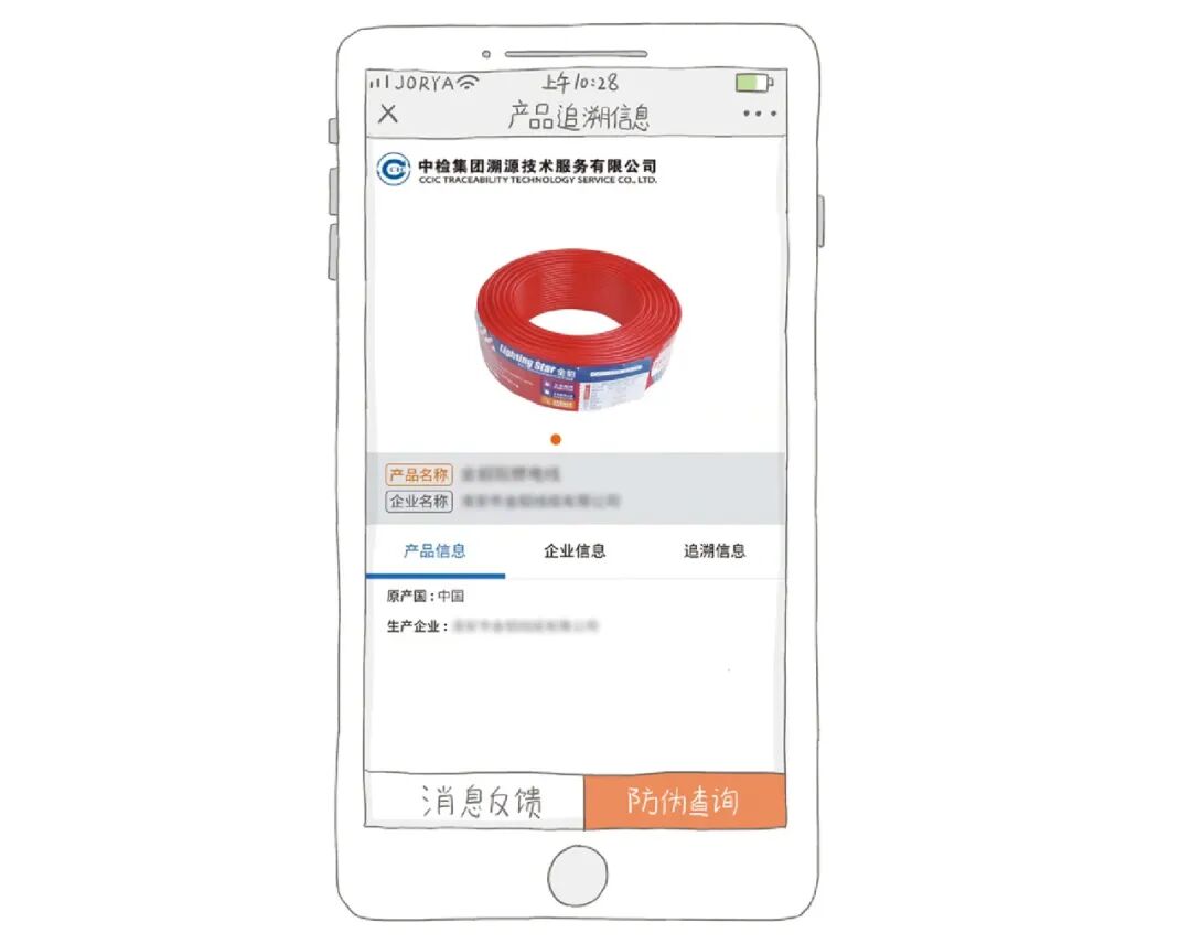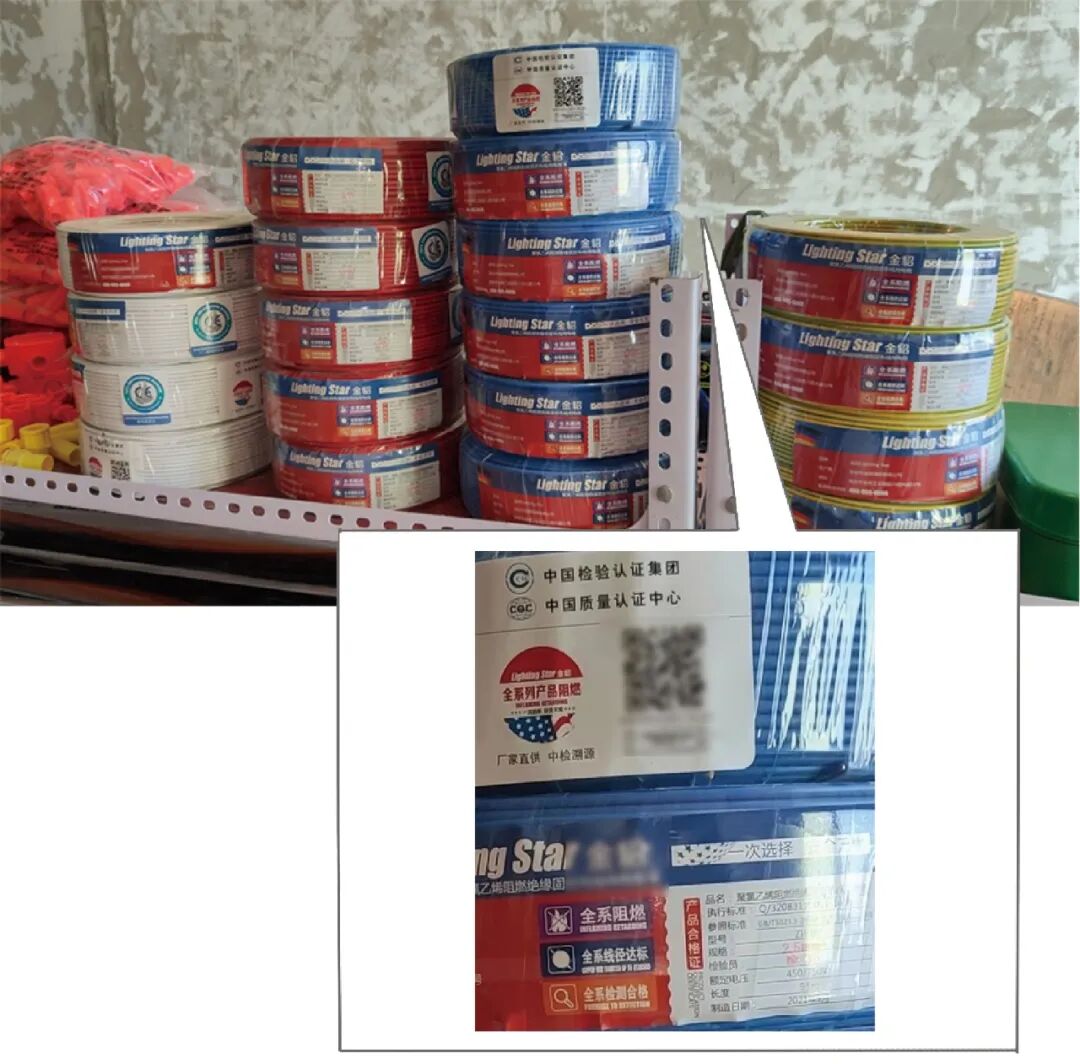 用溯源码检查电线的真伪。每包电箱上面都印有型号、安全标识和防伪二维码。市面上的假电线很多,难辨真伪,因此我们选择了有溯源码的电线,现场扫码、输入编码即可验证真伪。