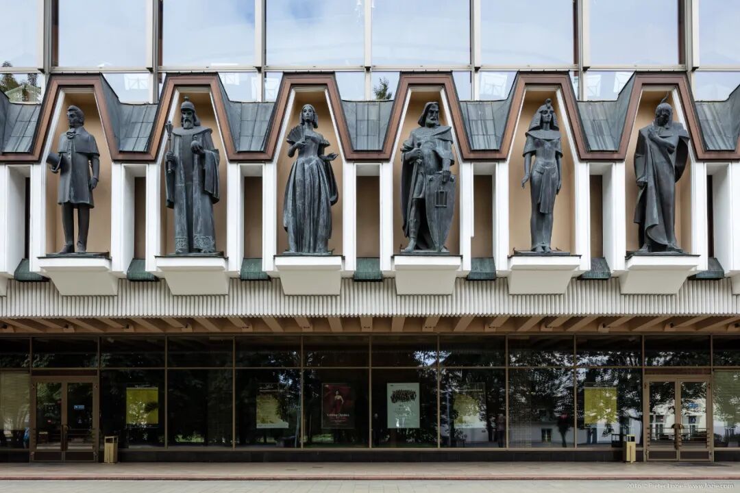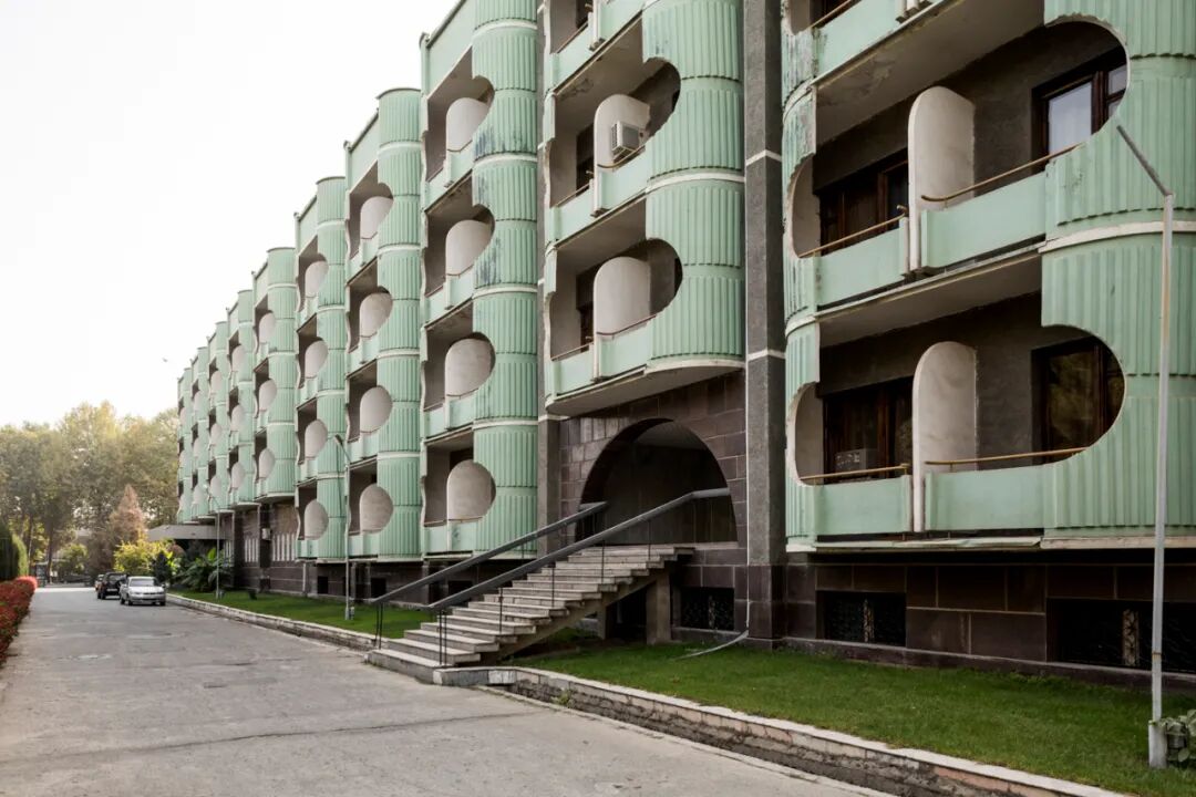 ✸ 在 20 世纪下半叶,苏联建筑在高度多样化的环境中传播了一种共同的审美,成为促进无视当地文化的极权主义意识形态,他们尝试设想一个统一、同质的社会的一个组成部分,这使得象征主义在建筑学中的发展在某种程度上达到了一个巅峰,粗野主义成为其典型的建筑表征。粗野主义诞生于战后的英国,在 1970 年代进入苏联建筑,用功能性和大规模生产定义的建筑形式取代了斯大林古典主义风格。通常所说的苏联现代主义是一种以大量体量和原始纹理为特征的建筑。然而,这个术语不仅仅是一种美学,它还包含一种附加到最终建筑的特定意识形态。苏维埃国家希望在整个苏维埃共和国创造一致的建筑形象和生活标准。苏联中亚的城市发展采取了特定的形式,从波斯和伊斯兰的文化中汲取灵感,这些影响早在并入苏联之前就塑造了该地区独有的建筑特征。来自基辅、莫斯科和列宁格勒的建筑师集中起来,以苏联的精神展示建筑和城市化。然而,当地建筑师对国家规定的风格进行了自由化。这些苏联亚洲区域的共和国的苏联建筑融入了东方建筑特色,在图案和马赛克、色彩和装饰品的使用中可见一斑,创造了一种特定于这种背景的野兽派美学,欧洲和亚洲的影响交织在一起。借此来表达建筑的当地文化转译。