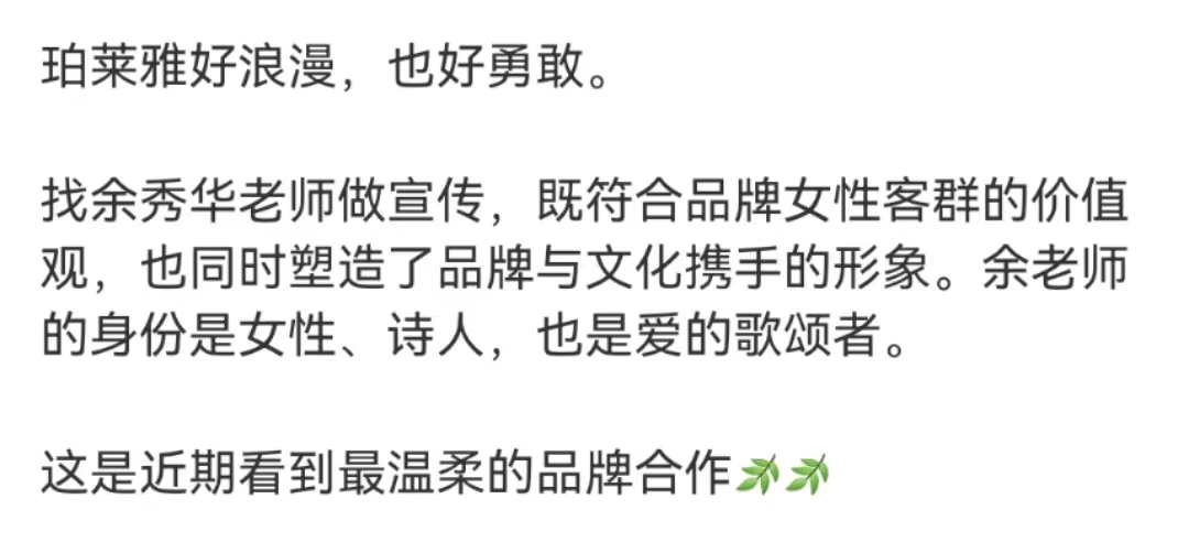 此外,在商业市场中因“鲜活人格”带来的人文温度和商业热度也可以使品牌从一众同质化明星偶像代言的营销方式中脱颖而出。当其他品牌还在试图借明星偶像来传播品牌价值时,余秀华厚重的人文底蕴甚至可以反过来充盈和丰富品牌价值。