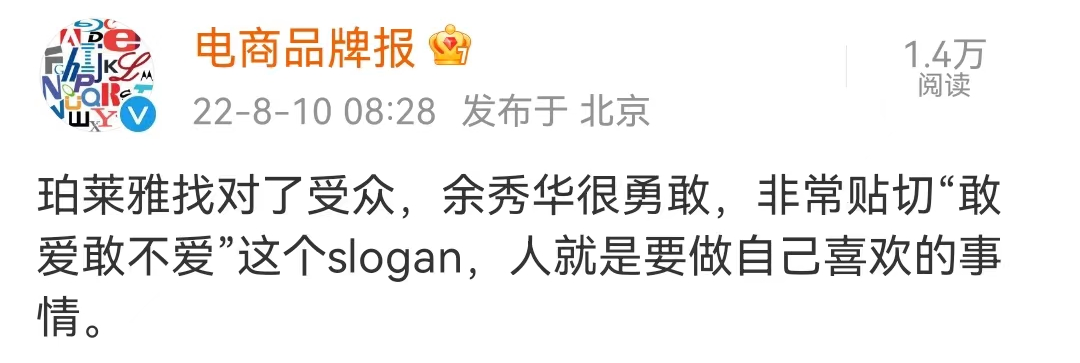 然而,正是在今日余秀华得以借女性主义思潮而产生商业价值的环境下,事件中“歇斯底里”的女性形象才能被大众施以理解和同情,事后余秀华配合珀莱雅发出“敢爱,也敢不爱”的slogan才因有了“故事背景”依托获得了更强的爆发力和感染力。品牌方在策划营销时充分信任大众舆论对女性主义思潮的坚守,大胆选择在“负面影响”尚未平息的时间点做出动作,大众以宽容支持的态度回应余秀华事件后,这场赌博以大获全胜收尾。
