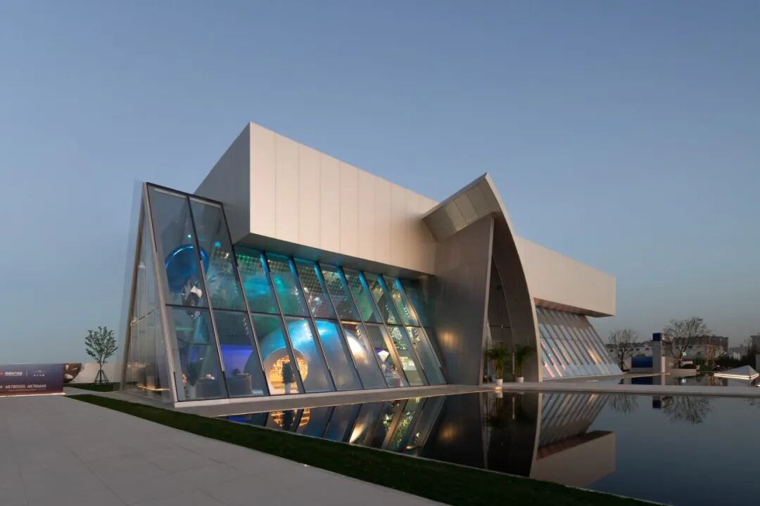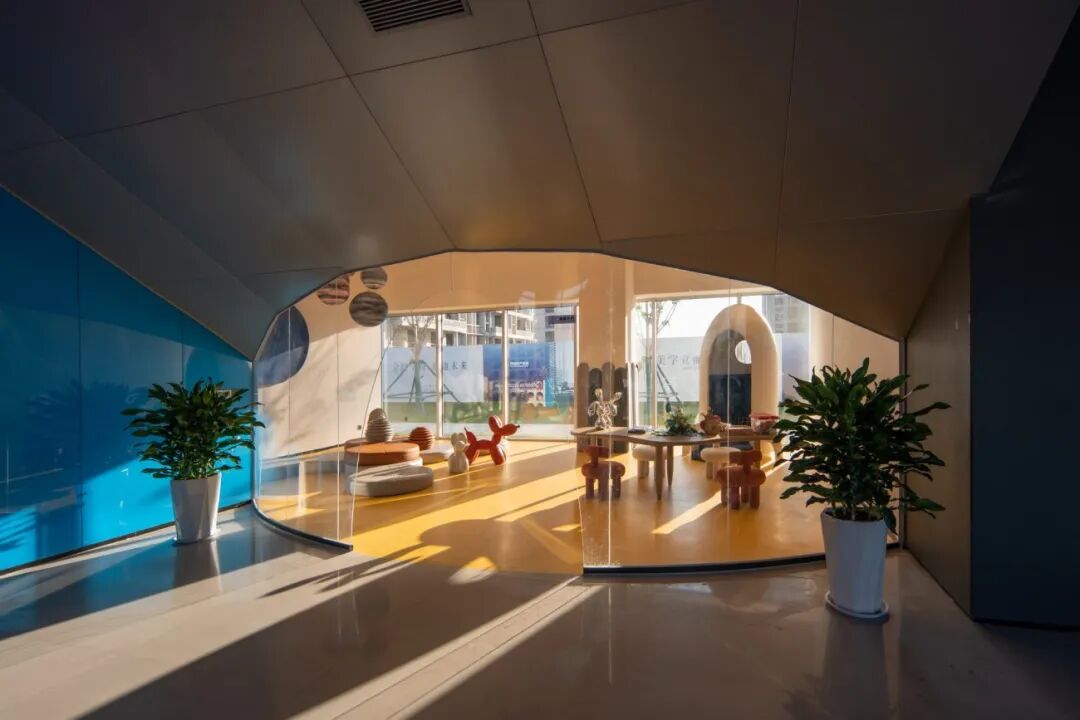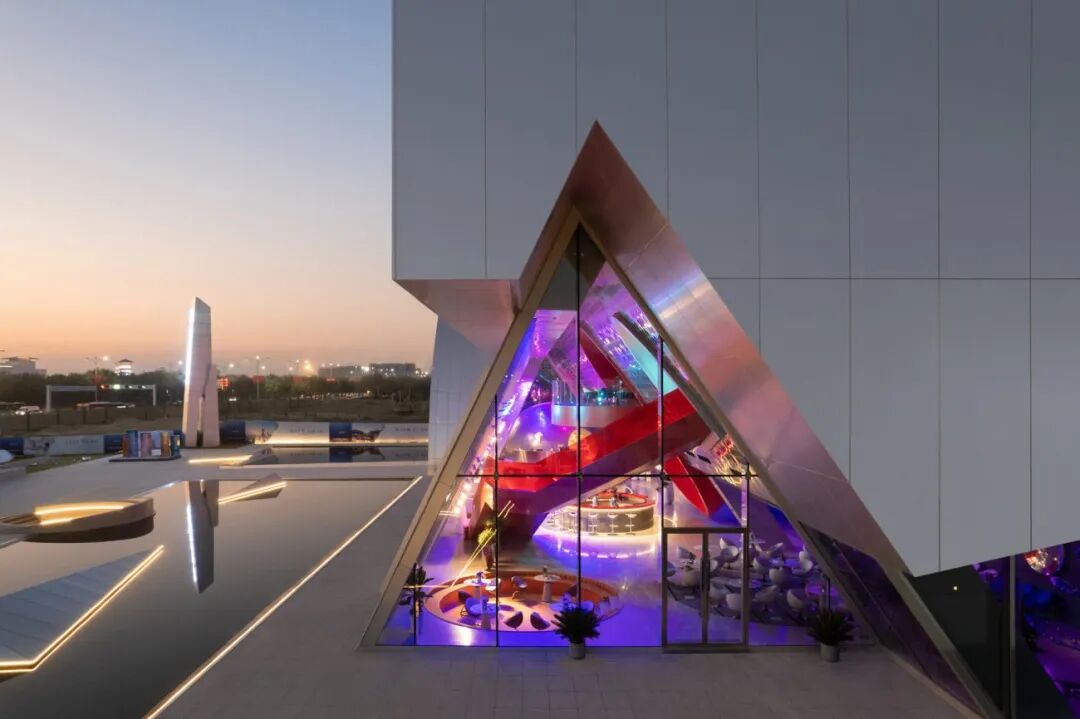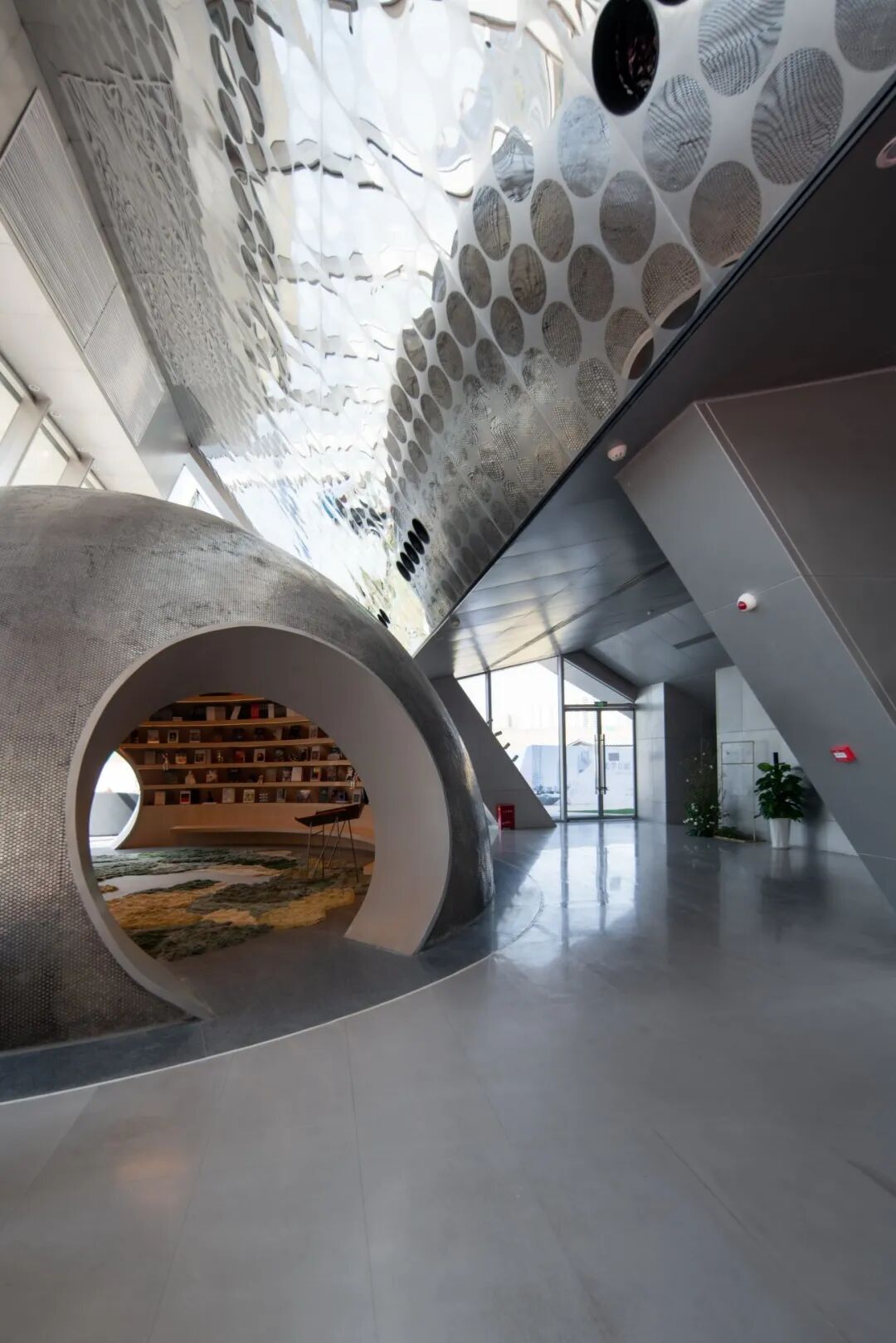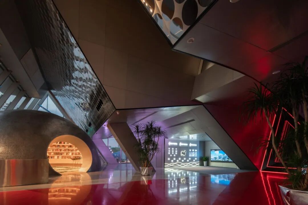 整体的室内设计采用建筑、室内一体化的设计手法。建筑内部形态各异的几何体,其材料与颜色透过玻璃幕墙成为建筑外立面展示的一部分。室内运用大量具有金属质感的材料,铝板、镜面不锈钢等营造时尚又具有未来感的氛围。大体量的几何体穿插使得空间更加具有雕塑感和趣味性,激发置身其中人群的好奇心与探索欲。
