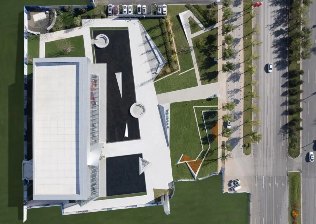室外景观通过使用同样的线性设计语言,并结合几何形体的景观构筑物,使整个建筑与周边环境协调的融为一体。并且通过运用不同的几何图形来分隔景观,从而营造适宜的景观步道,增加用户的体验感,运用水景和景观构筑物将建筑与自然相融合为使用者带来自然感。