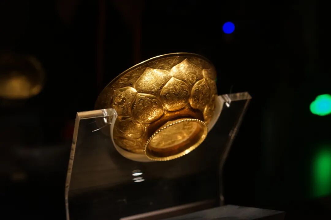 还有鸳鸯莲瓣金碗、鎏金海兽水波纹银碗、鎏金银铁芯铜龙……展厅里珍宝济济一堂,丰富的创作题材、顶级的工艺,携带着历史的气魄铺面而来。