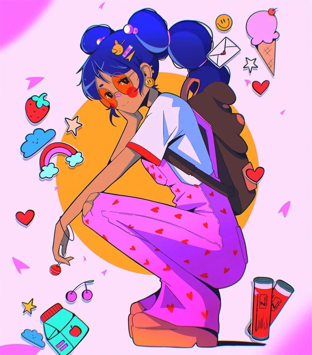 插画师Mercedes Bazan笔下这组各具特色的二次元少女插画,色彩温柔可爱,配色有一点复古朋克,还有赛璐璐风格。高饱和的色彩视觉冲击力非常强,令人着迷的缤纷色彩